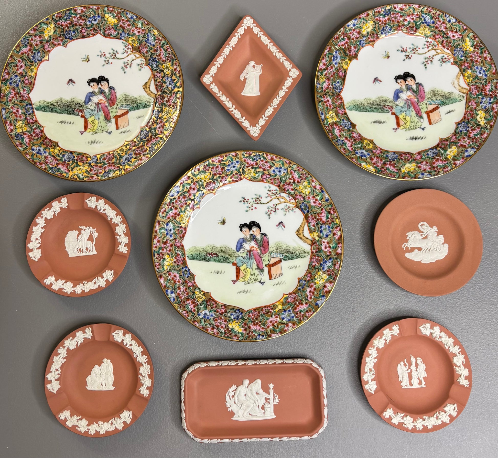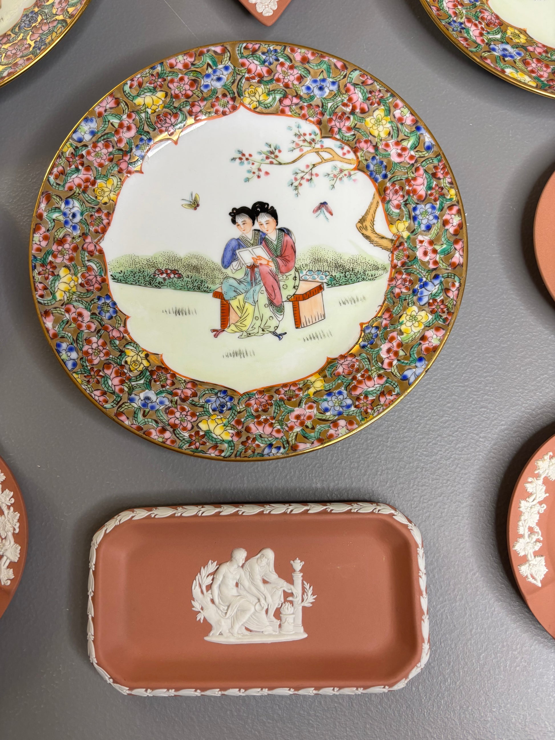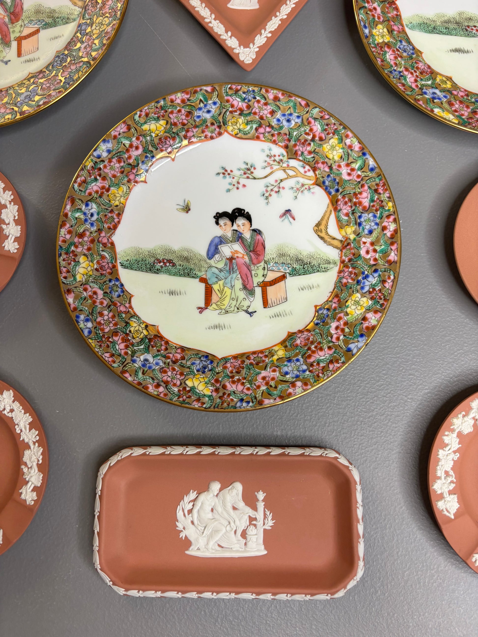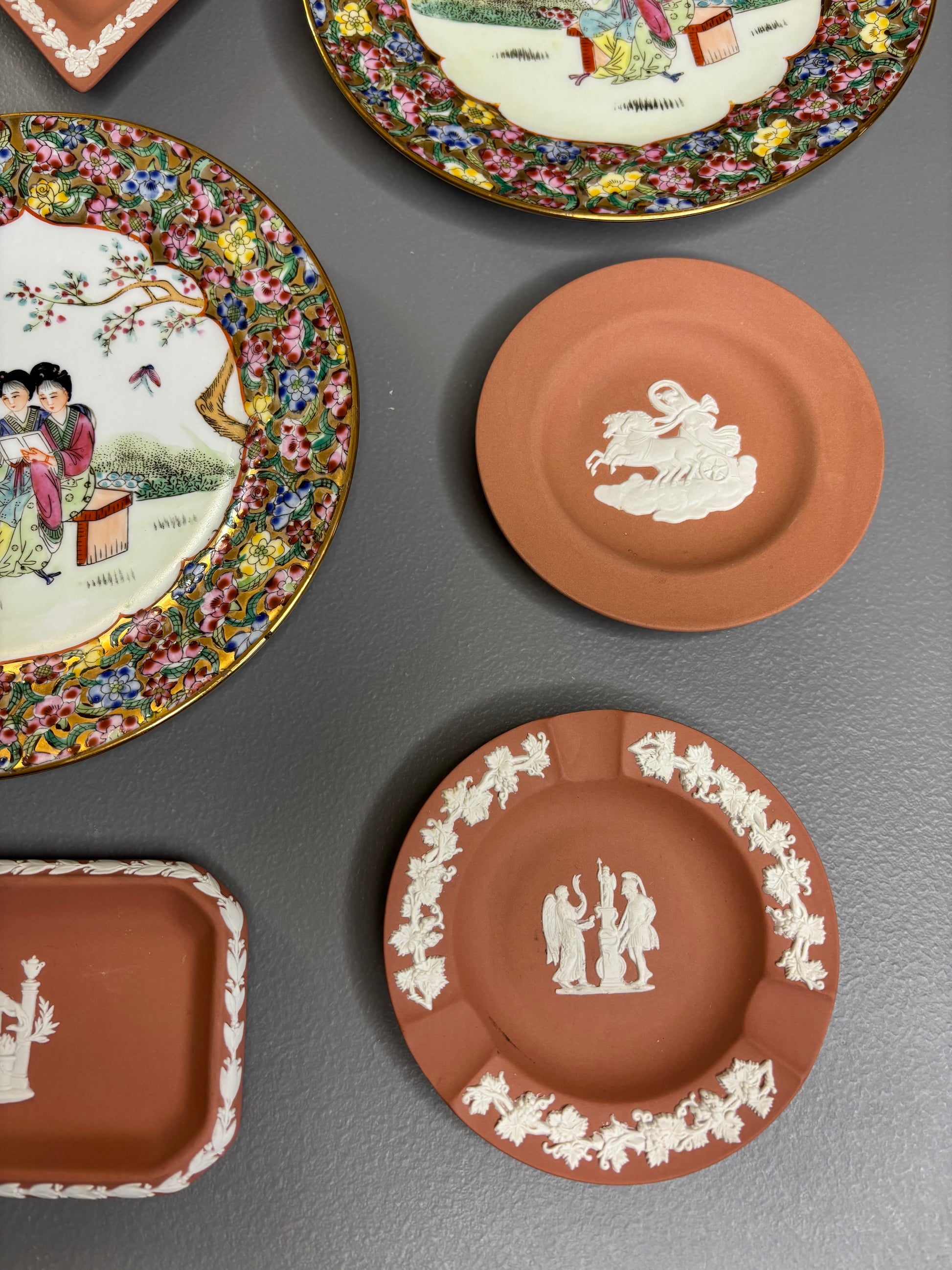 Beautiful instant plate wall! Includes 3 Famille Rose plates and 6 Wedgwood terra cotta dishes!