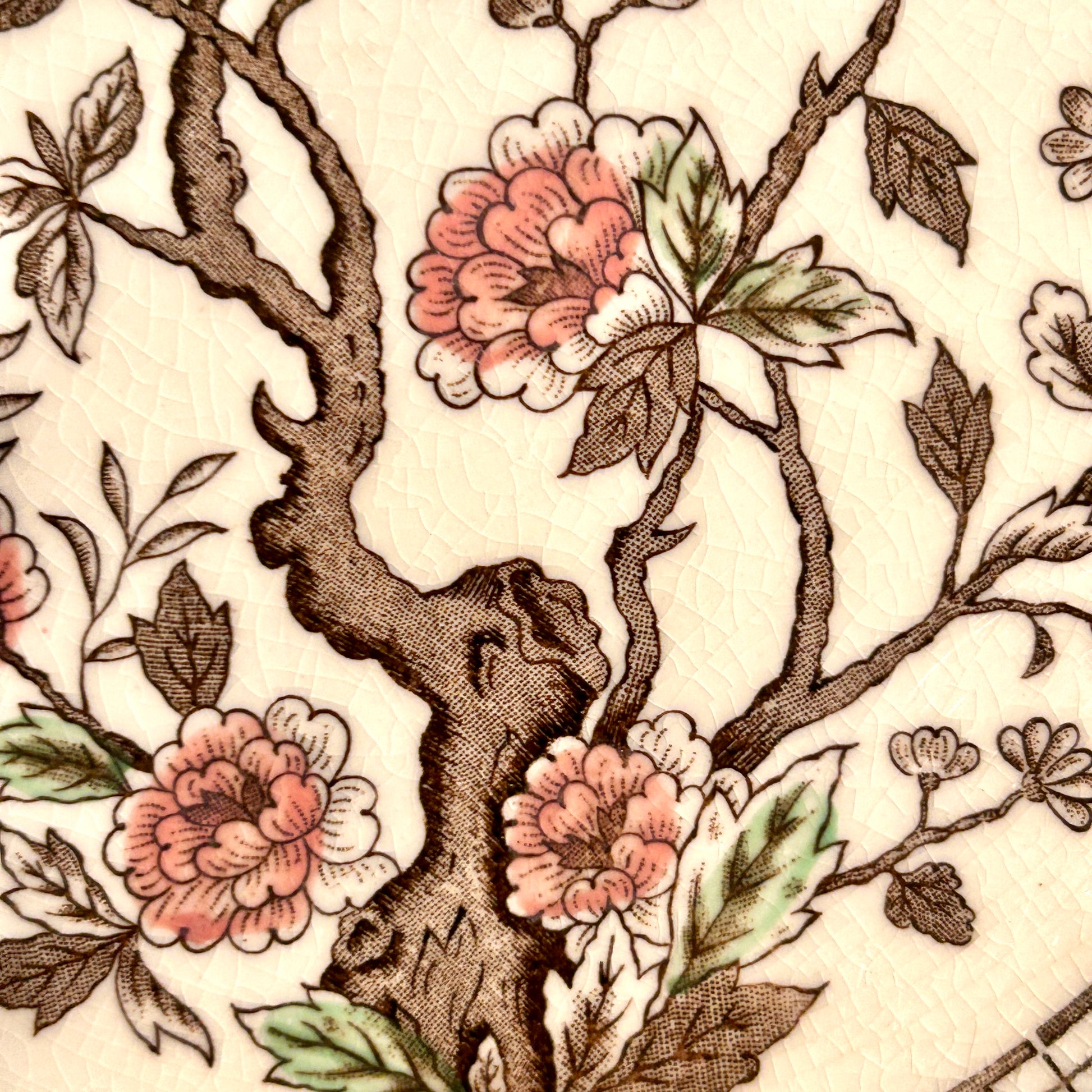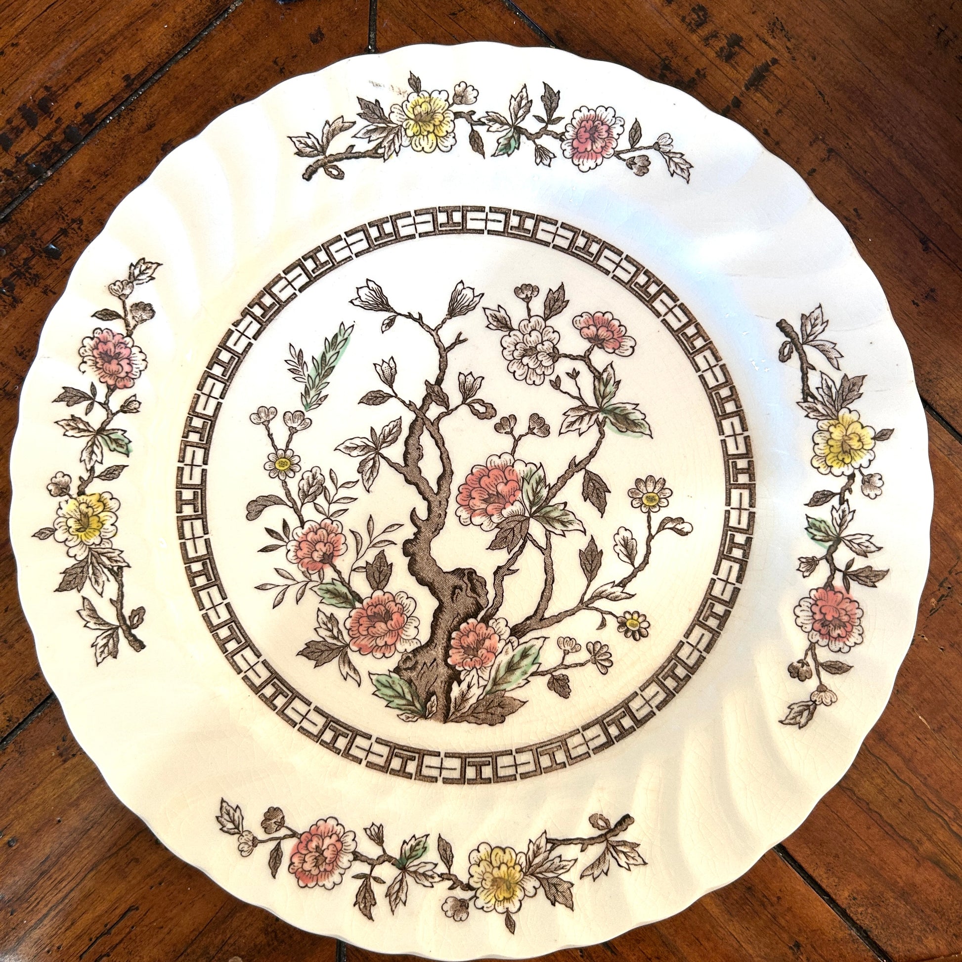 These dinner plates come in a set of six and feature a vintage Kashmir tree design with stunning scalloped edges. The warm beige brown color is complemented by pink and yellow botanical flowers. These plates are perfect for stacking alongside your BORDALLO cabbage ware and measure 10.5 inches in diameter. They are also free of any chips or cracks for a flawless dining experience.Beautiful for Thanksgiving table (warm browns) Christmas greens, and Easter pastels