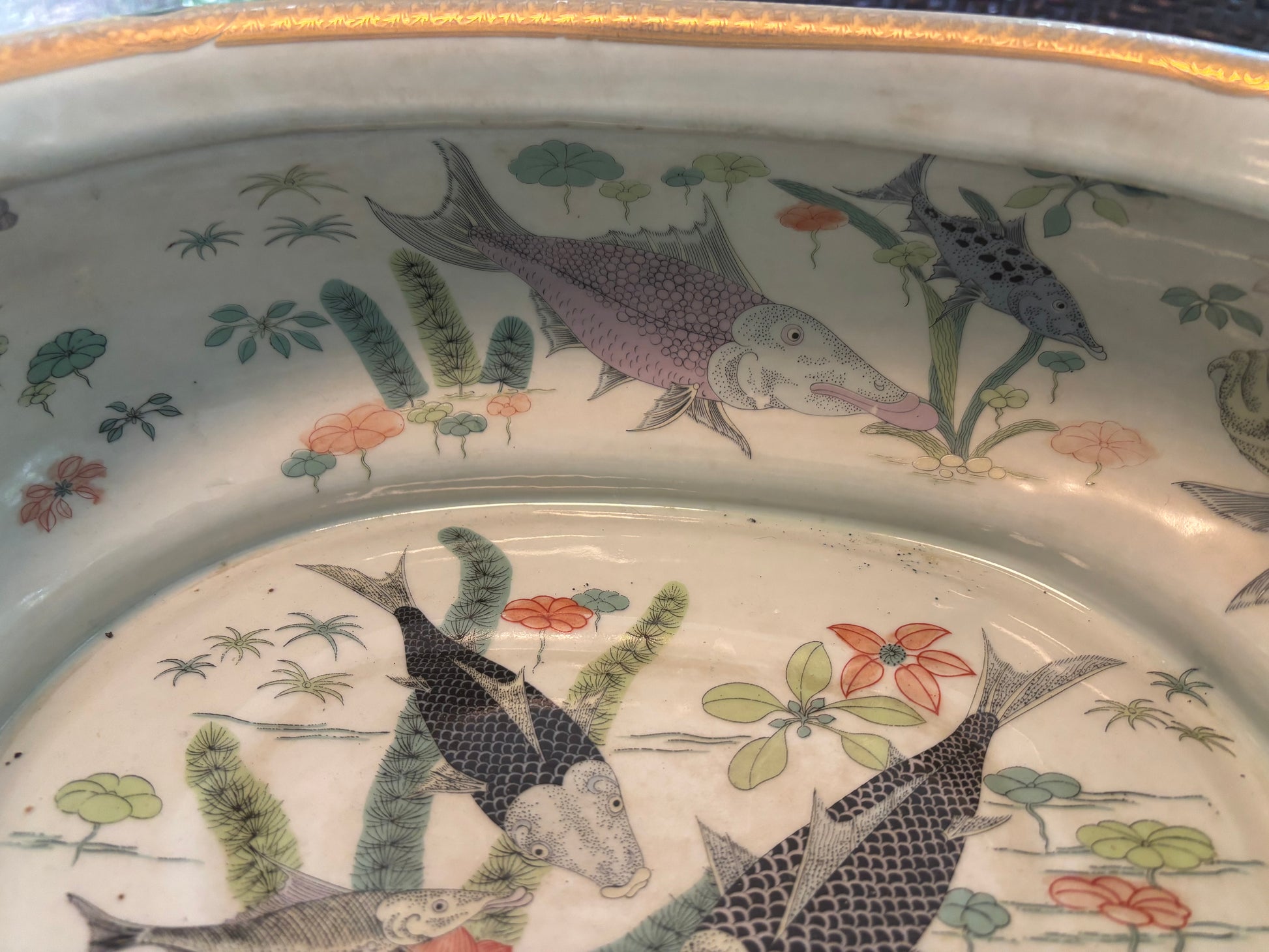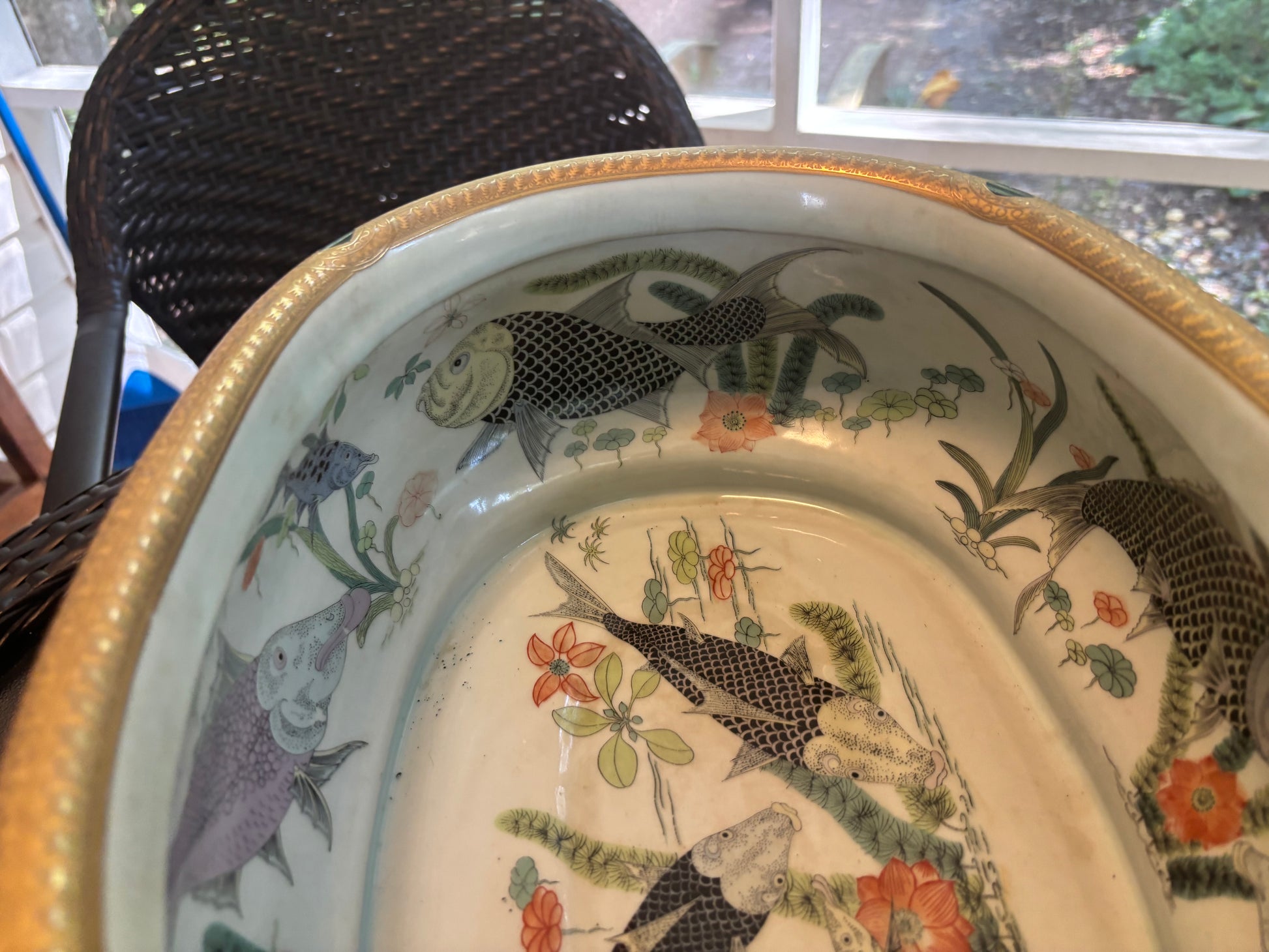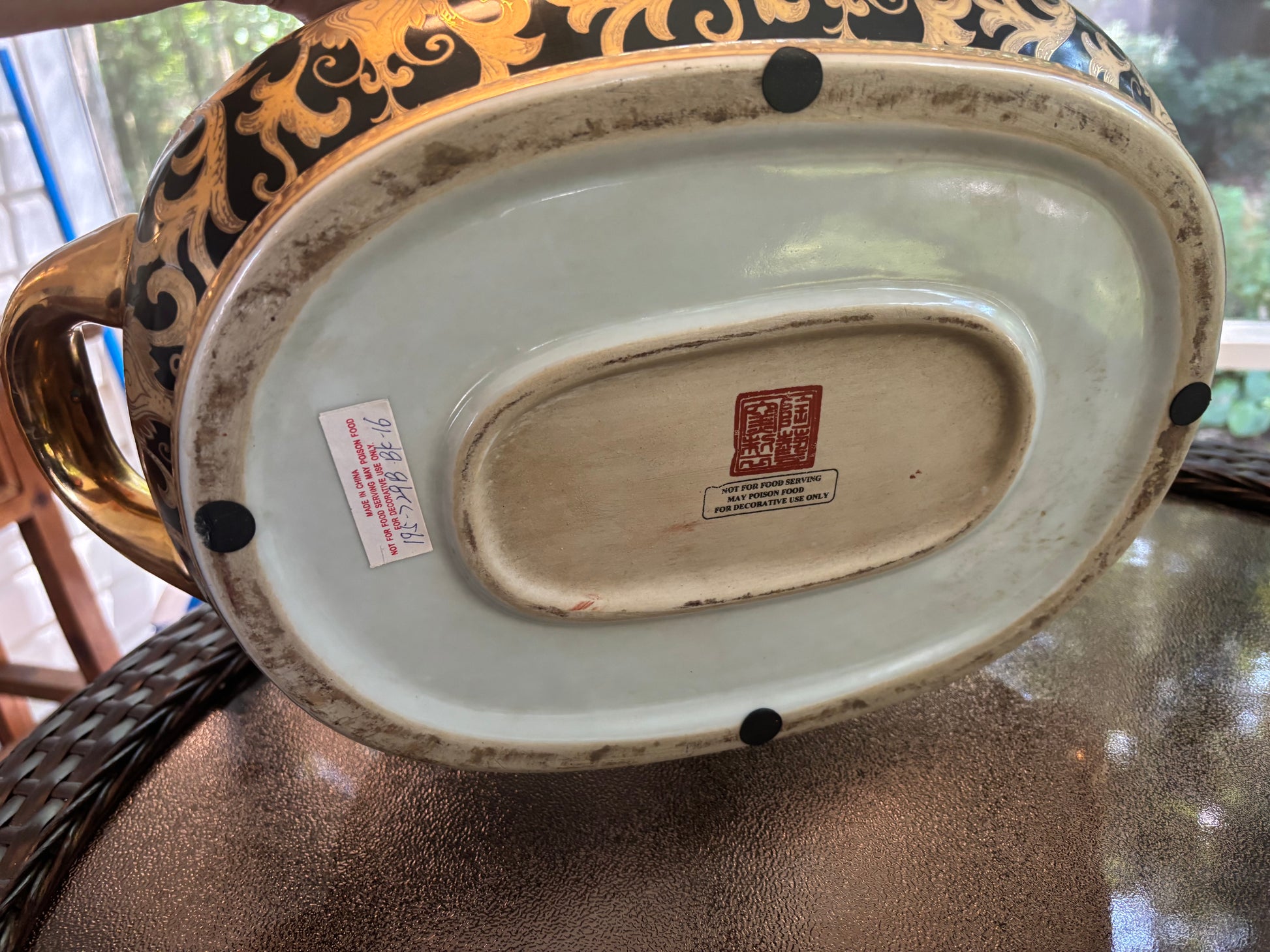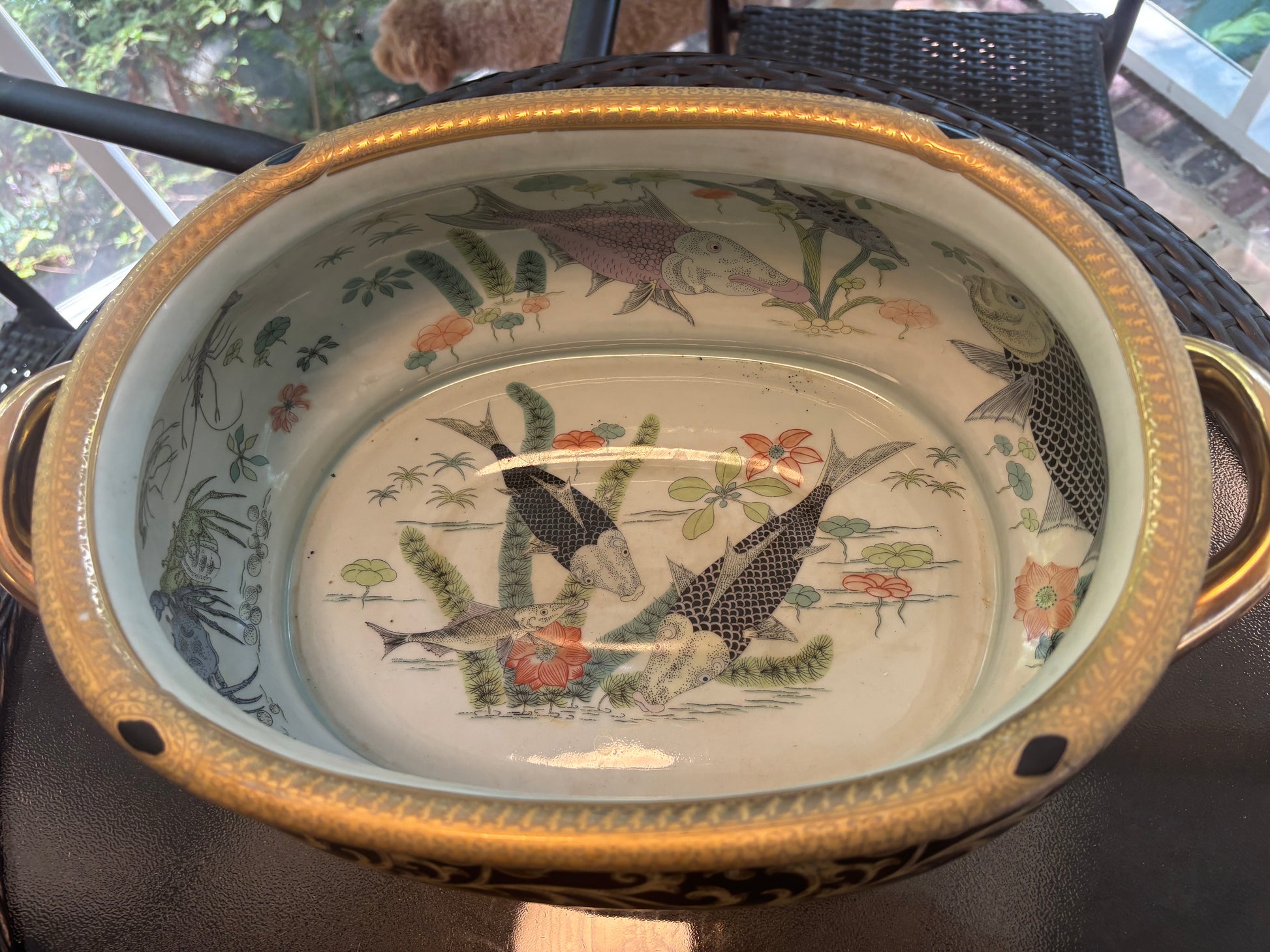 Stunning 18” Handpainted black and gold footbath planter on stand! Features unique sea life inside including fish, crabs, and shrimp! Measures 18” x 11” and 7.5” in height on stand. In excellent condition!