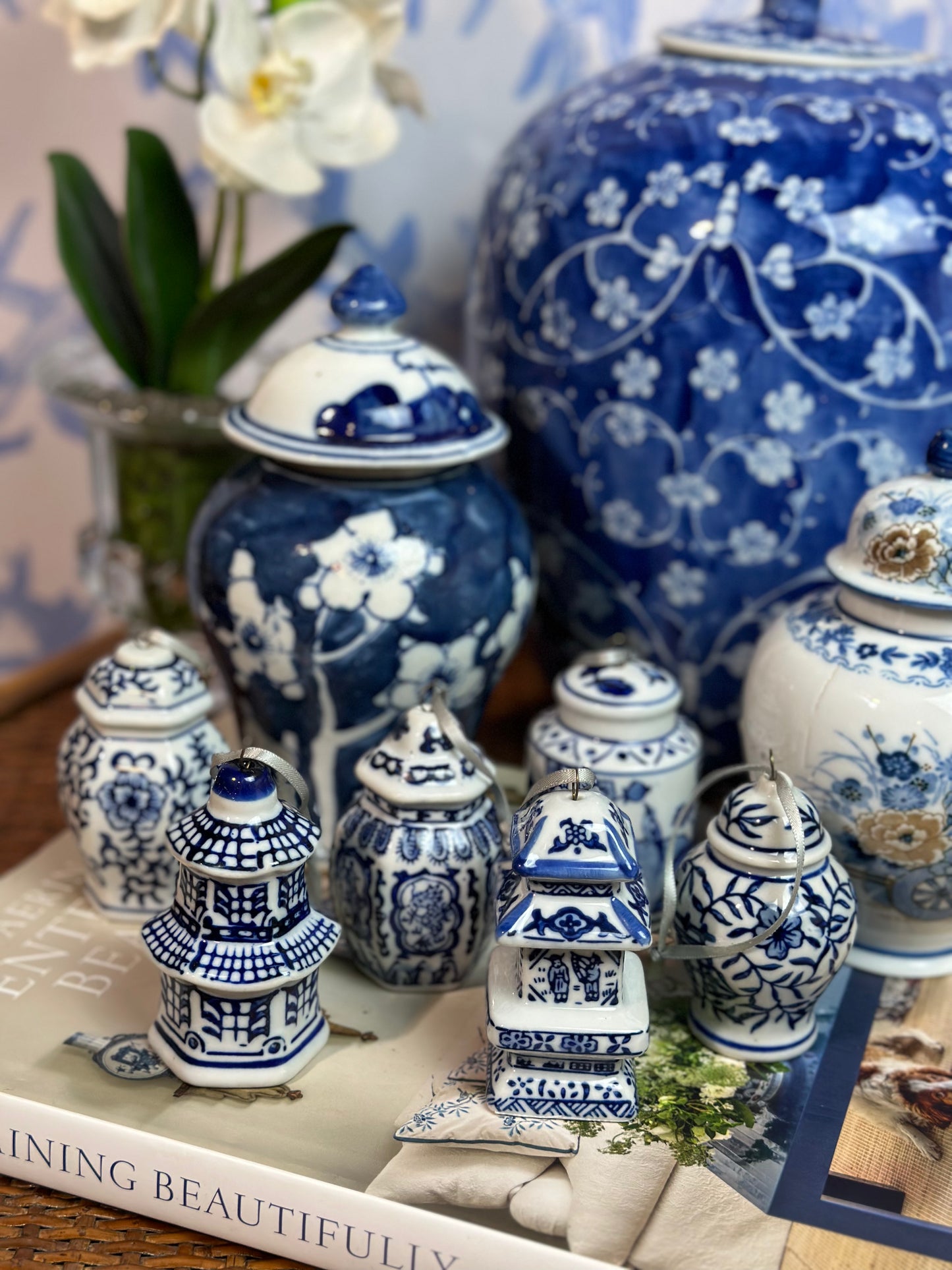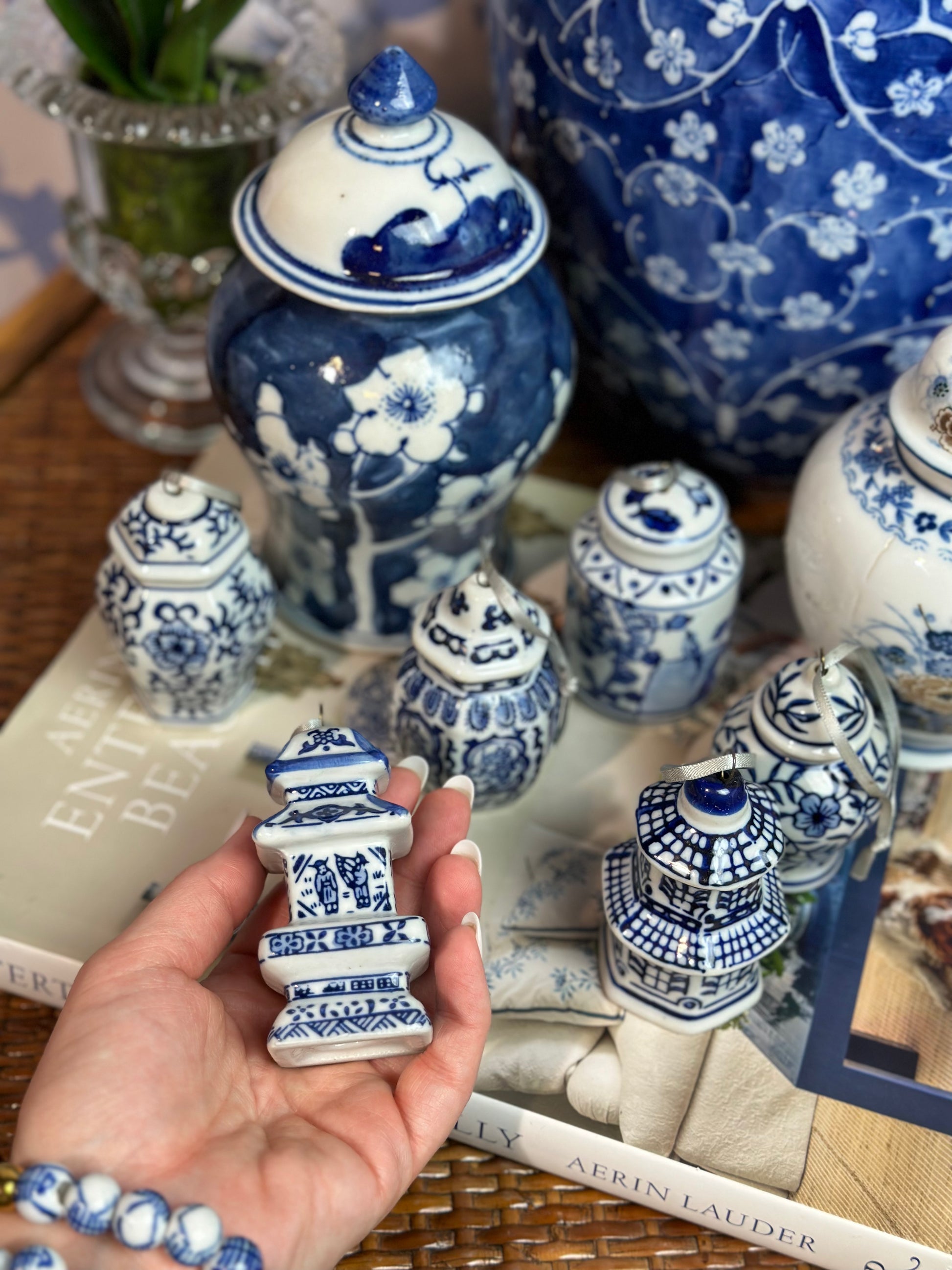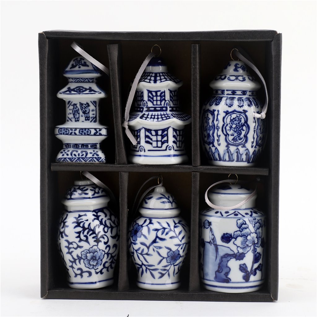 Bring timeless charm to your home with this set of six porcelain ornaments. Featuring classic blue and white pagodas and jars, made in China by Danny’s Fine Porcelain