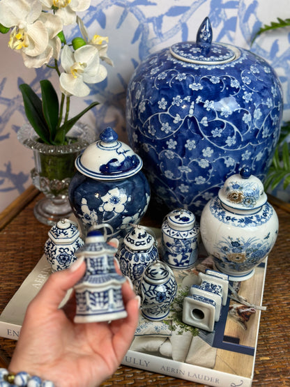Danny’s Fine Porcelain- Set (6) Blue & White Chinoiserie Pagoda Porcelain Ornament Set, 3.5" Tall