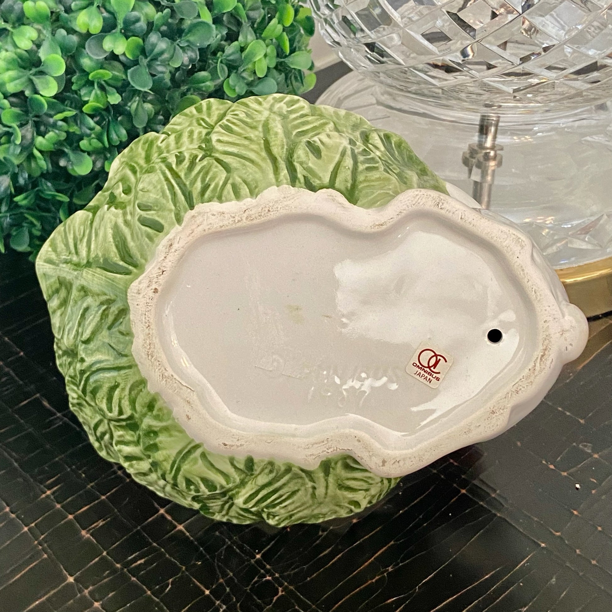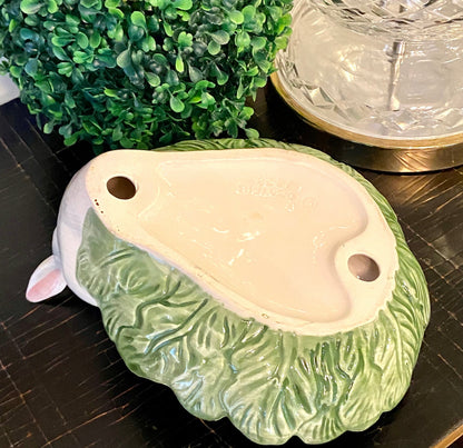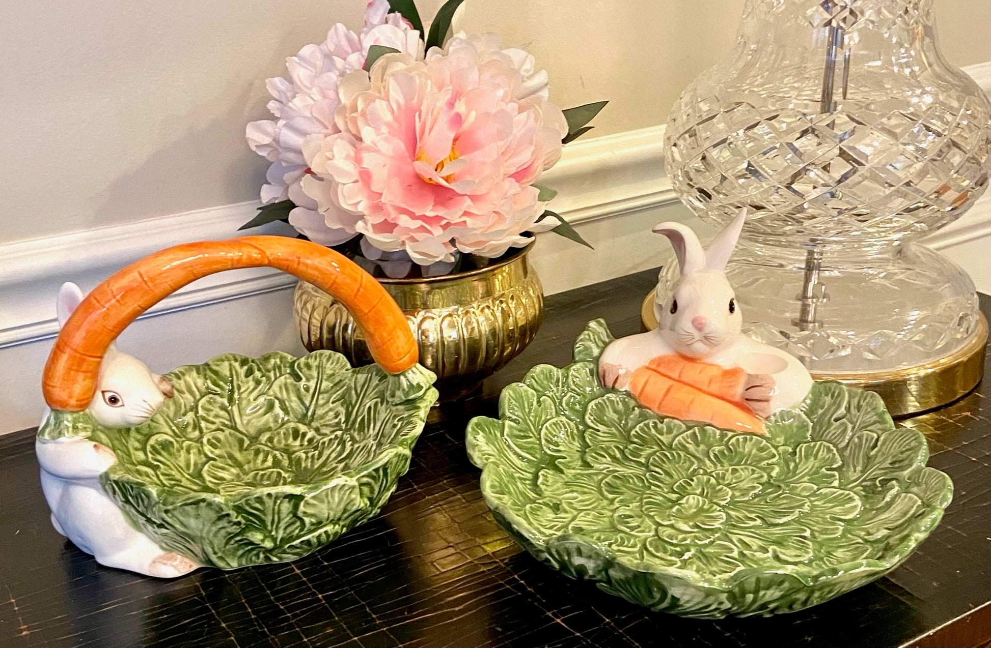 Set of 2 sweet majolica style bunny rabbit with carrots and cabbage dishes