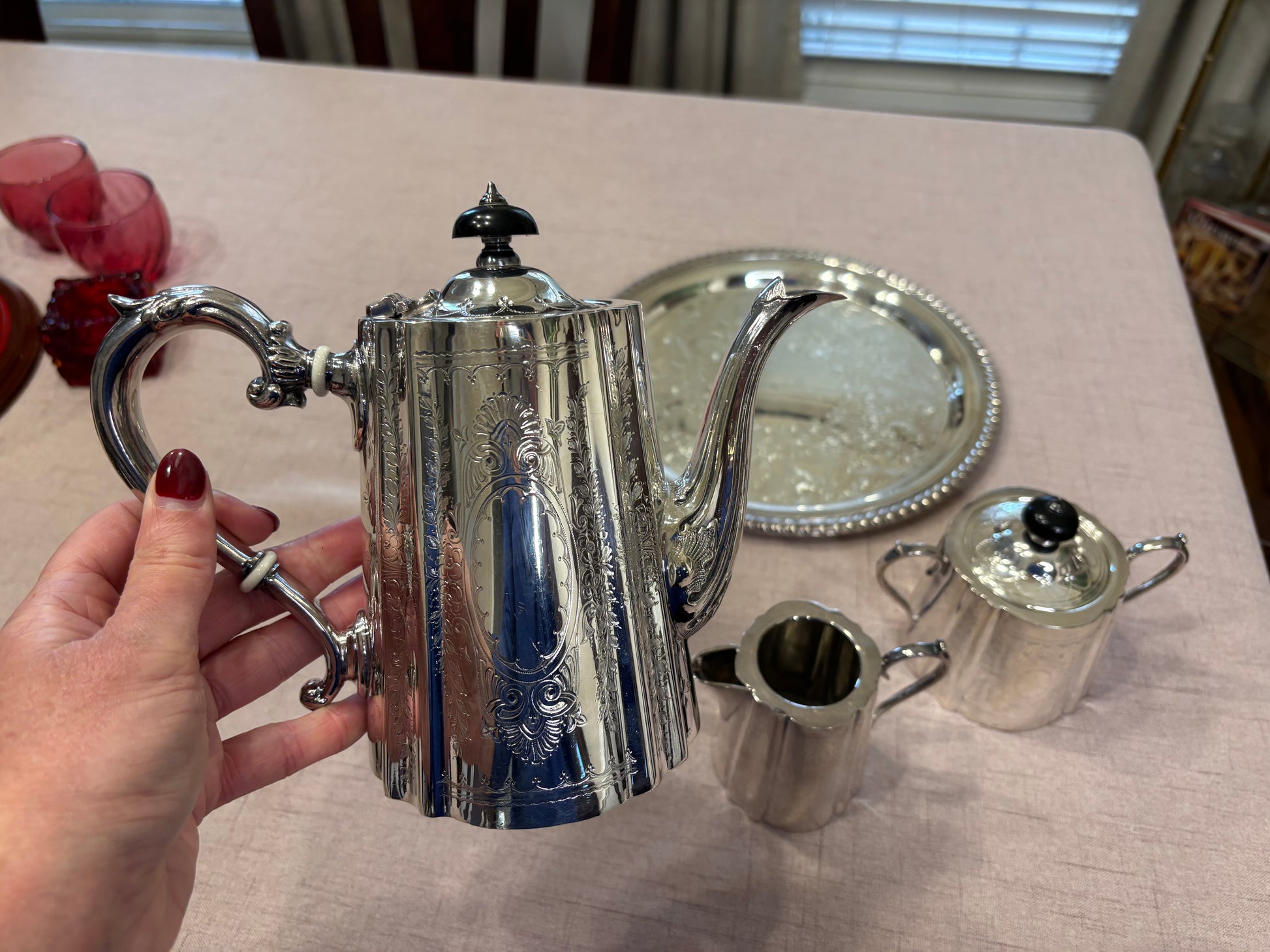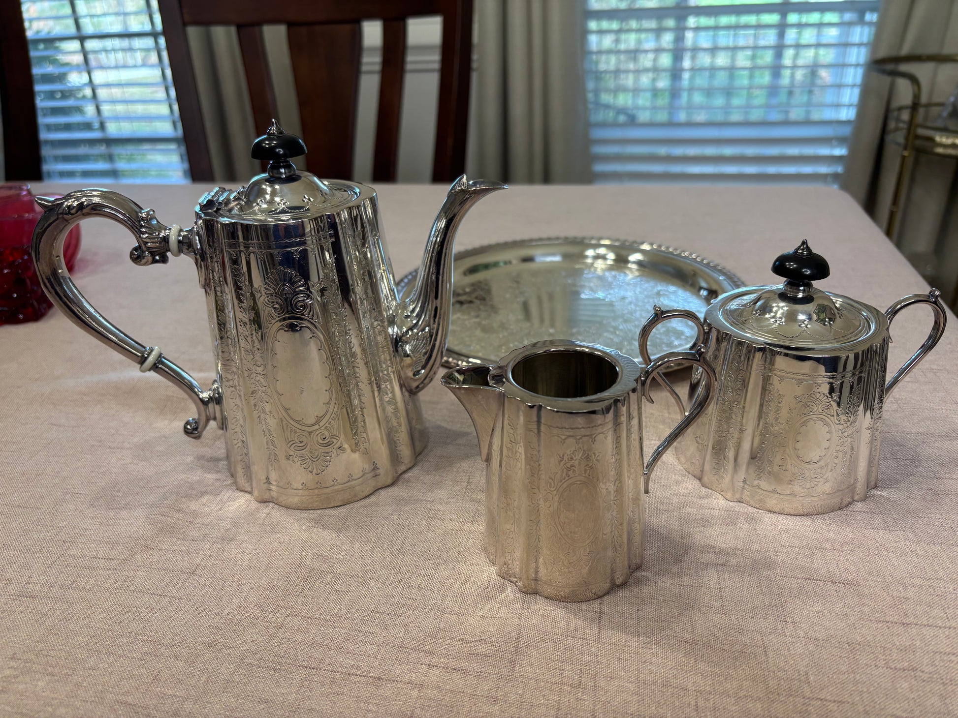 Stunning Barker Ellis three piece tea set! Includes pitcher, creamer, and sugar!
