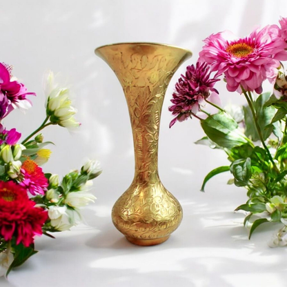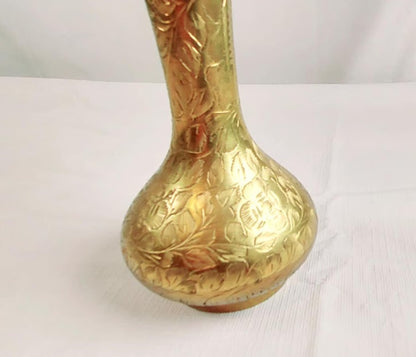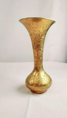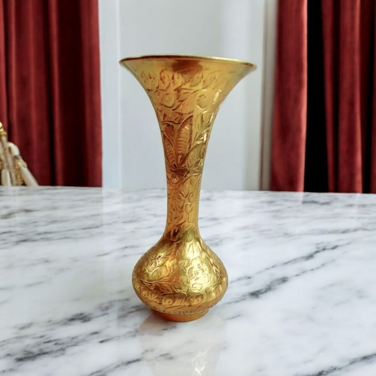 The Vintage Brass Etched Vase is a beautiful, small vase adorned with intricate floral etchings. At 6 inches tall, it is the perfect addition to your home decor. Crafted in India and in excellent condition, this vintage piece adds a touch of elegance to any room.