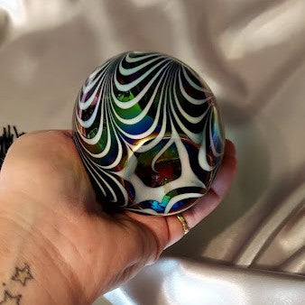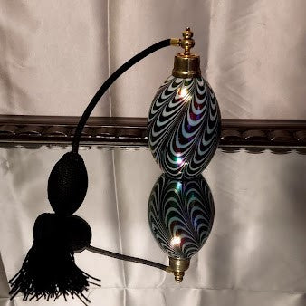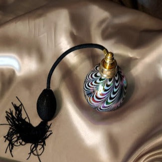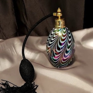 Add a touch of old world elegance to any room with this unique vintage perfume bottle with atomizer! Gently pulled feather glass and swirls of white, black and iridescent colors make this a conversation-starter. A black atomizer with a tassel adds a hint of mystery. Make it yours today!