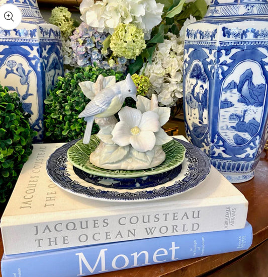Danny’s Fine Porcelain | Blue & White Songbird Garden Tray with Bronze Handles – 15” x 8.5”