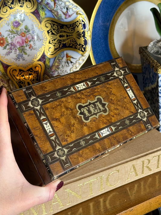 Antique English BIRDS EYE MAPLE Wood “Tea” Caddy with Bone & Mother-of-Pearl Inlay, c. 1820–1850