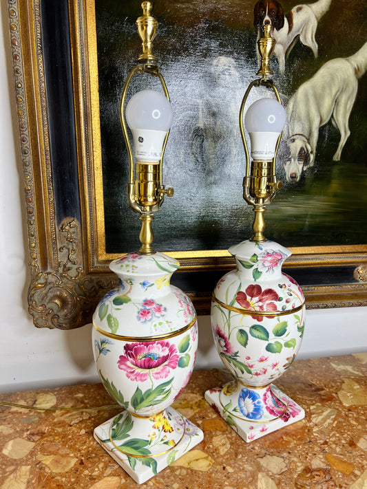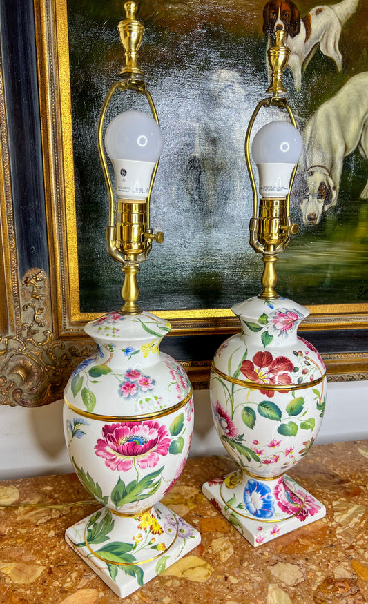 Sophisticated Mid Century Hand Painted Chinoiserie Porcelain Lamp Ornate Brass Base