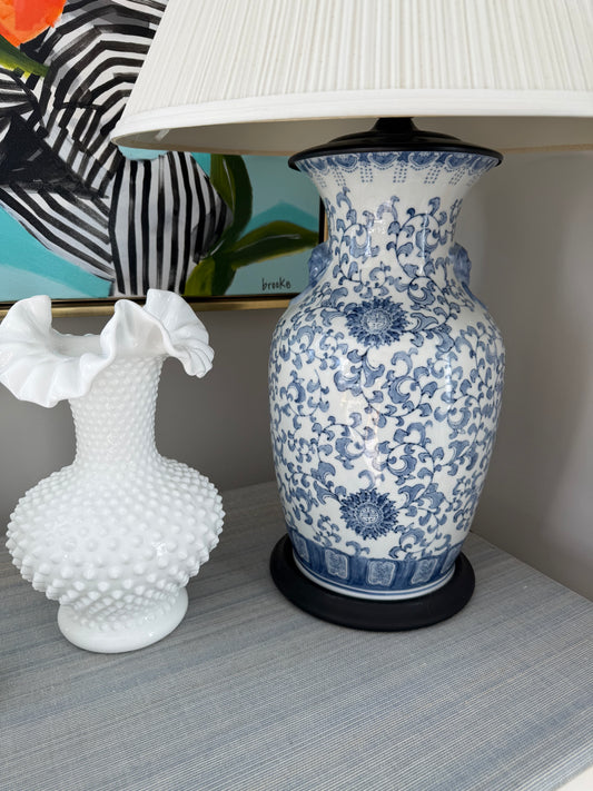 Chic vintage chinoiserie blue and white faux bamboo lamp.