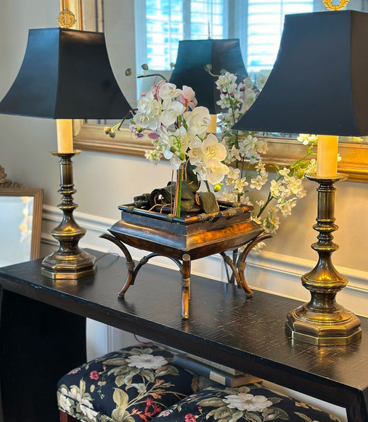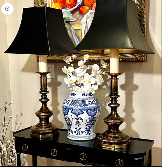 Stunning Statuesque pair of vintage gold gild & Ebony Buffet lamps 33 in