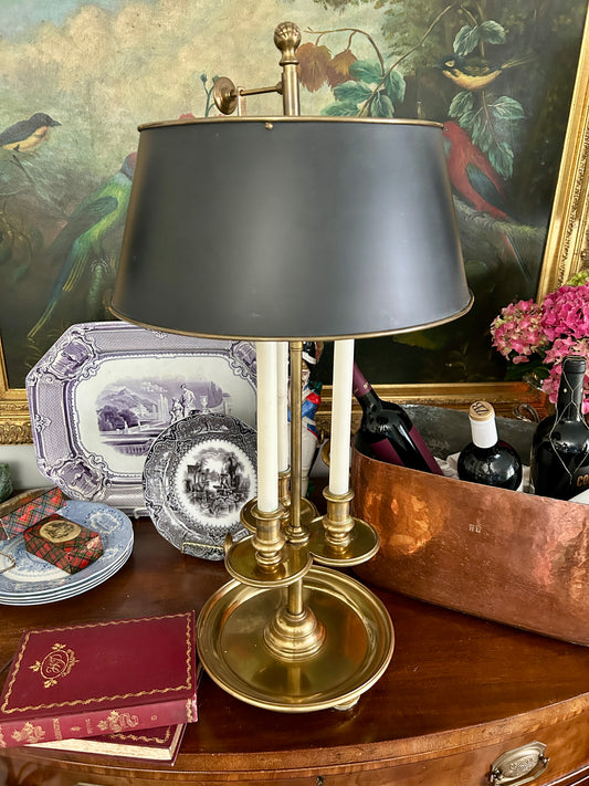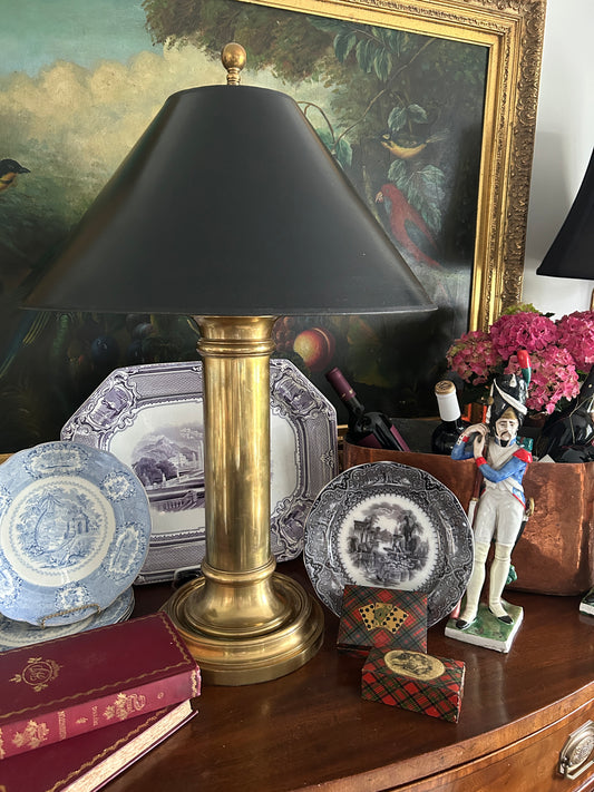Vintage stamped brass boudoir lamp with black shade