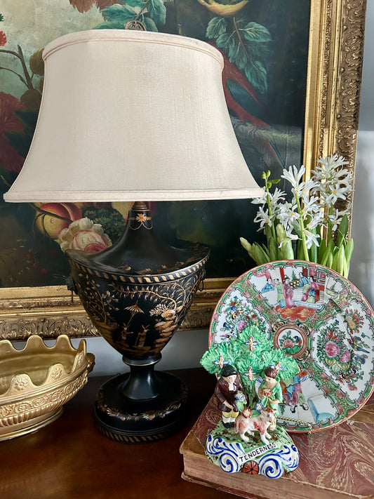 Vintage Famille Noir Matte Black Lamp With Tobacco Leaf/Ornate Crane Design 20 in