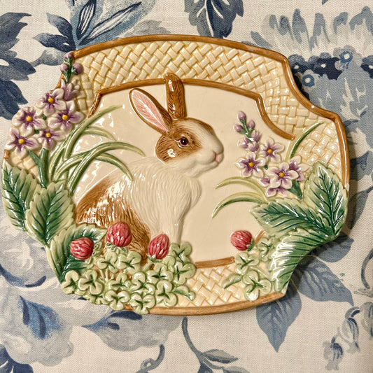 Set of 2 sweet majolica style bunny rabbit with carrots and cabbage dishes
