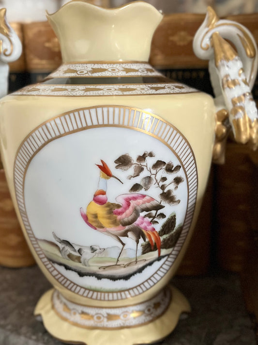 Sevres Style Chelsea House Porcelain Urns with Gilded Scroll Handles & Hand-Painted Exotic Birds — Pair