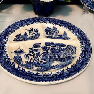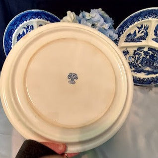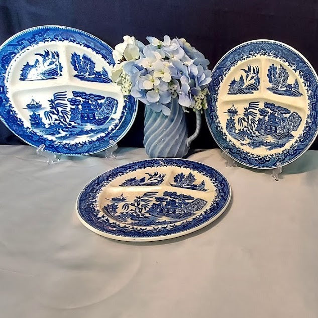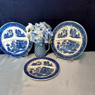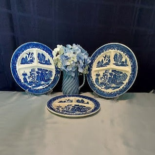 These 3 blue willow grill plates, produced by Moriyama in occupied Japan, are crafted from ceramic and boast a 10.5" diameter. With intricate design and experienced craftsmanship, these plates are sure to be cherished for many years to come. From the 1940's.