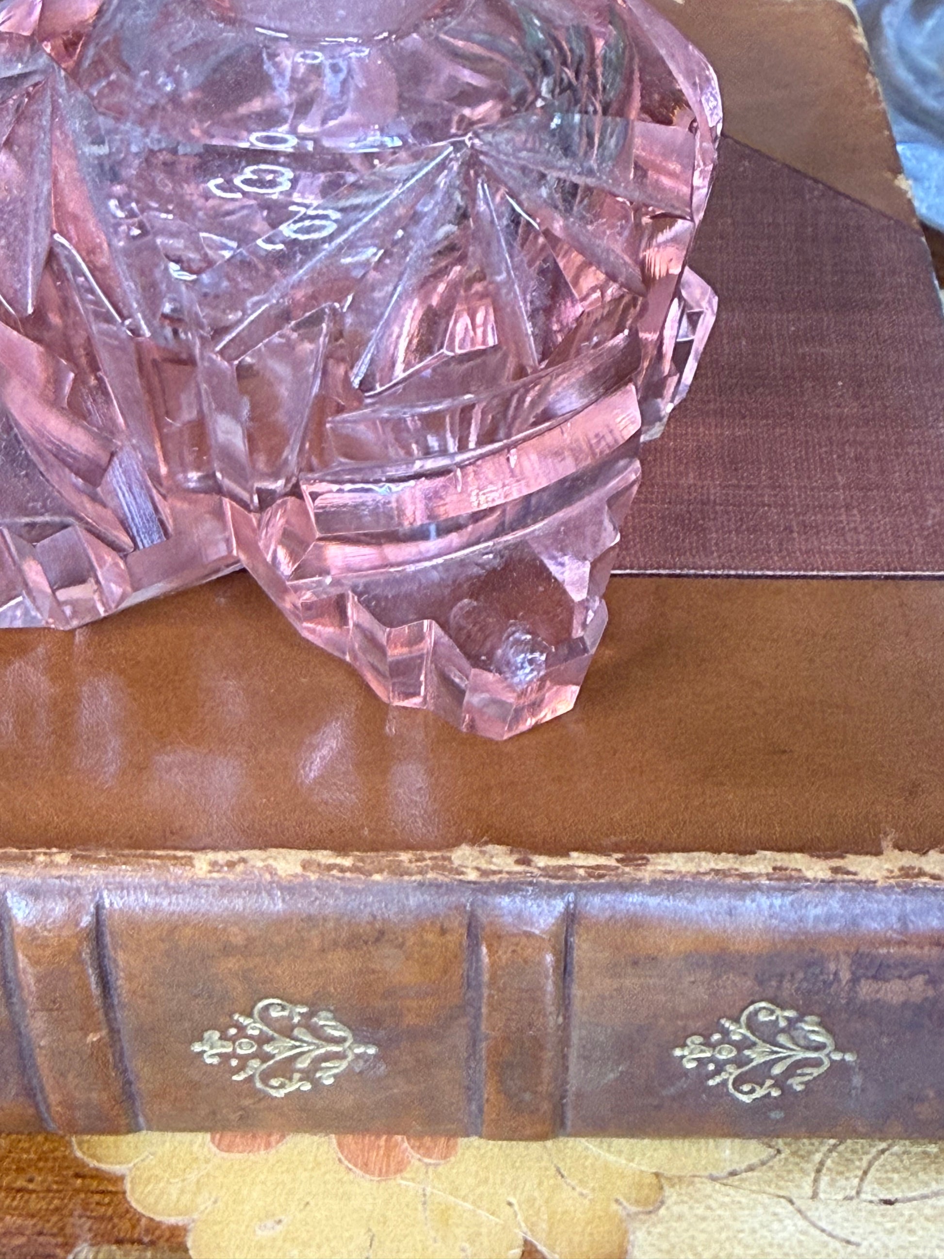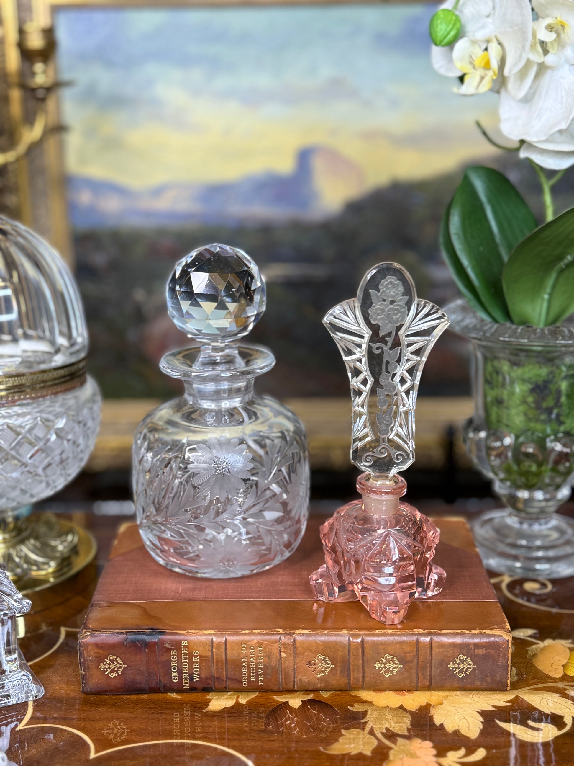 A beautiful antique Czechoslovakian pink cut crystal perfume bottle featuring an elegant etched floral stopper and a deeply faceted base. Known for exceptional glass craftsmanship, Czechoslovakia produced some of the finest decorative crystal pieces of the late 19th to early 20th century, and this bottle is a wonderful example of that tradition.