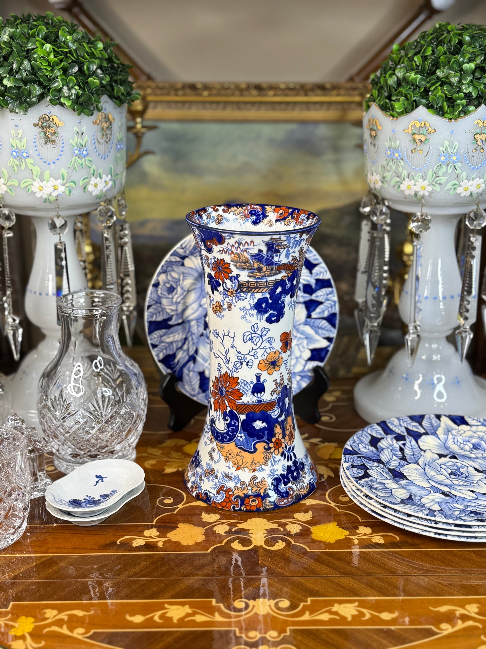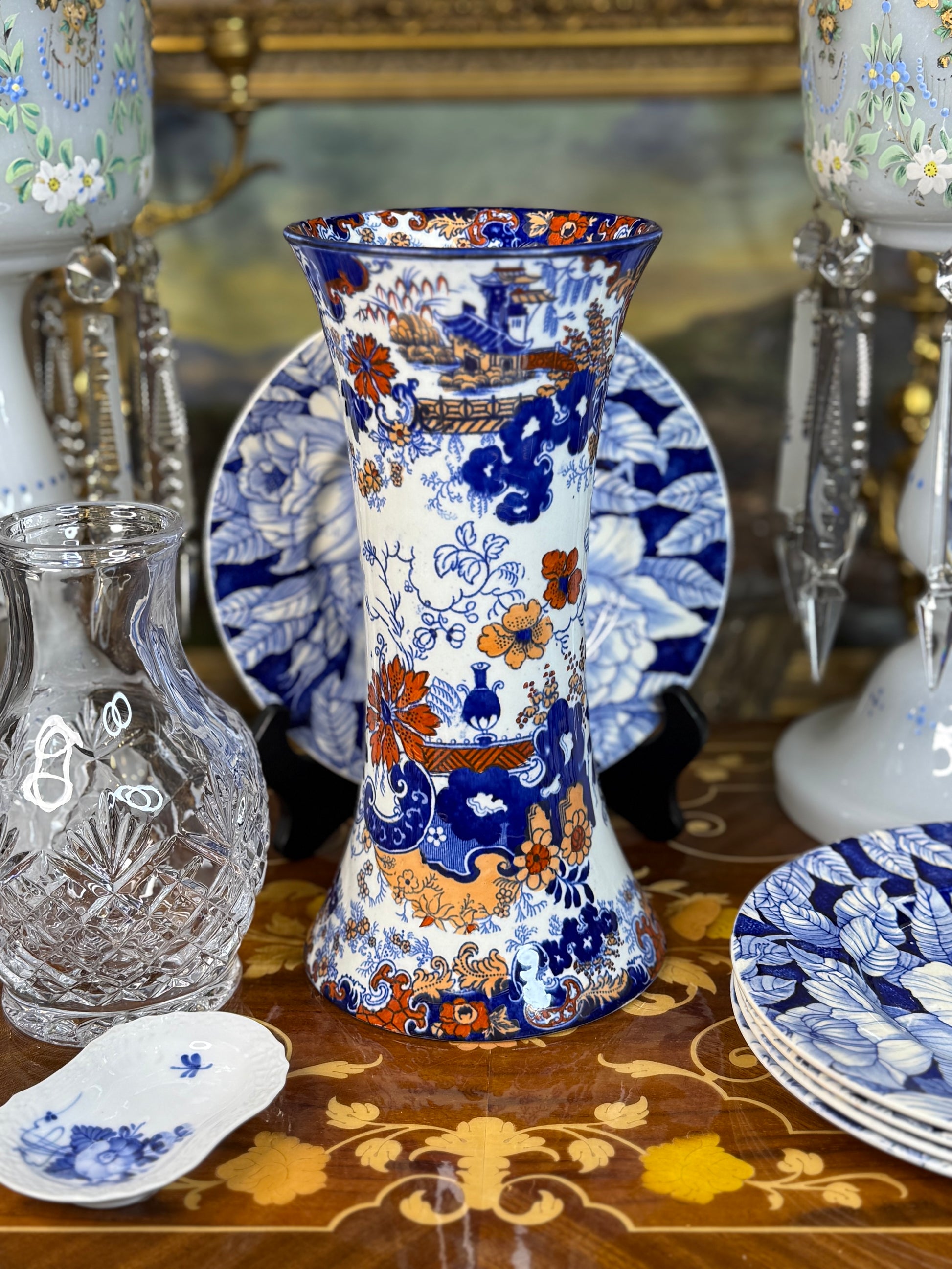 A striking antique English Imari-style vase featuring classic chinoiserie scenery and florals in rich cobalt blue, warm rust, and soft ivory. This tall, gently flared form makes a beautiful statement piece on a mantel, entry console, or bookshelf, and layers seamlessly with blue and white collections.