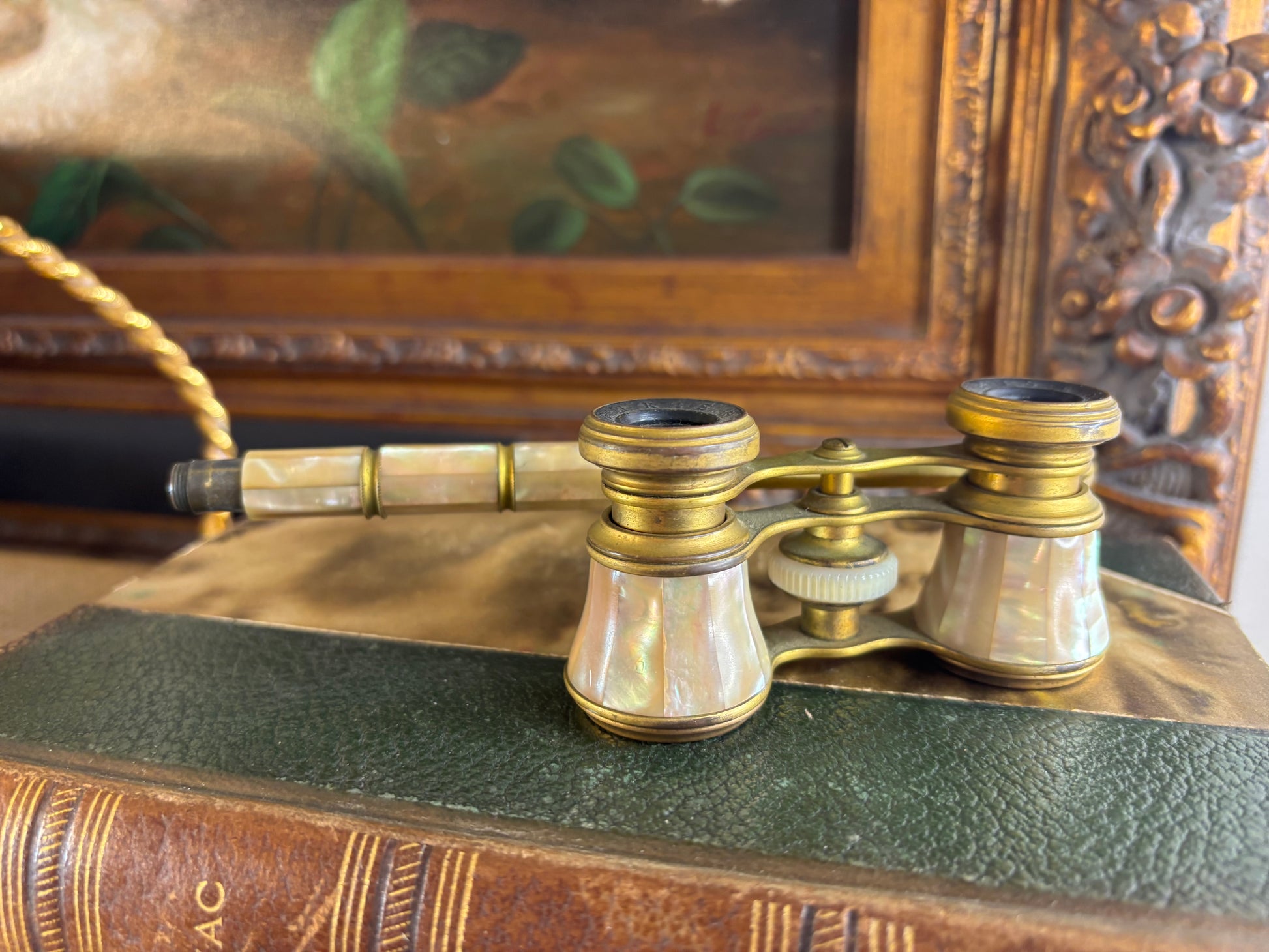 Antique French Paris Opera glasses with mother of pearl and handle! Is kidding the cap at end of handle. Still displays beautifully. Has some residue inside lenses. As is!