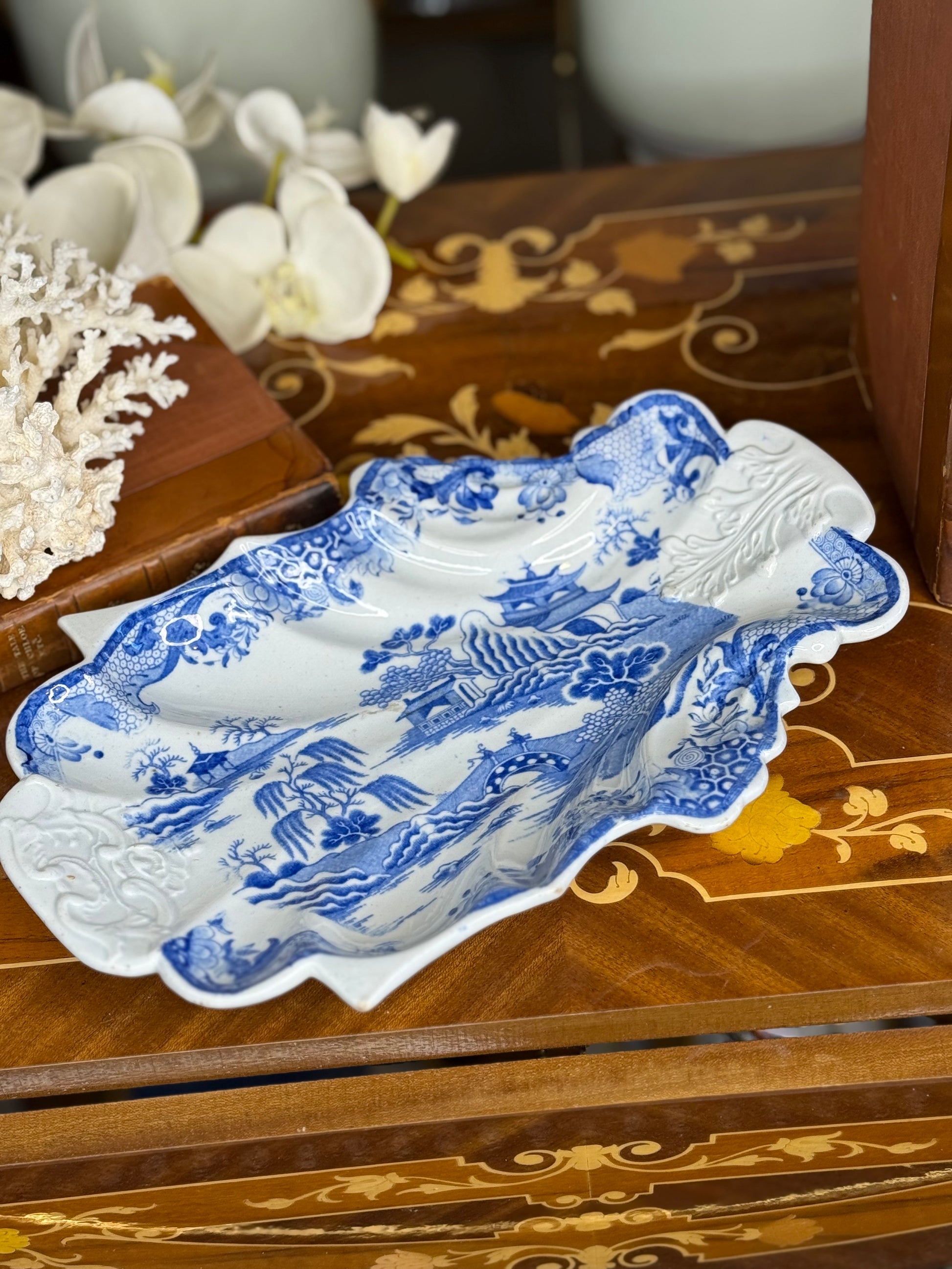 Antique Mason’s Ironstone Shell-Form Dish – Blue & White, c. 1890, 10” Long