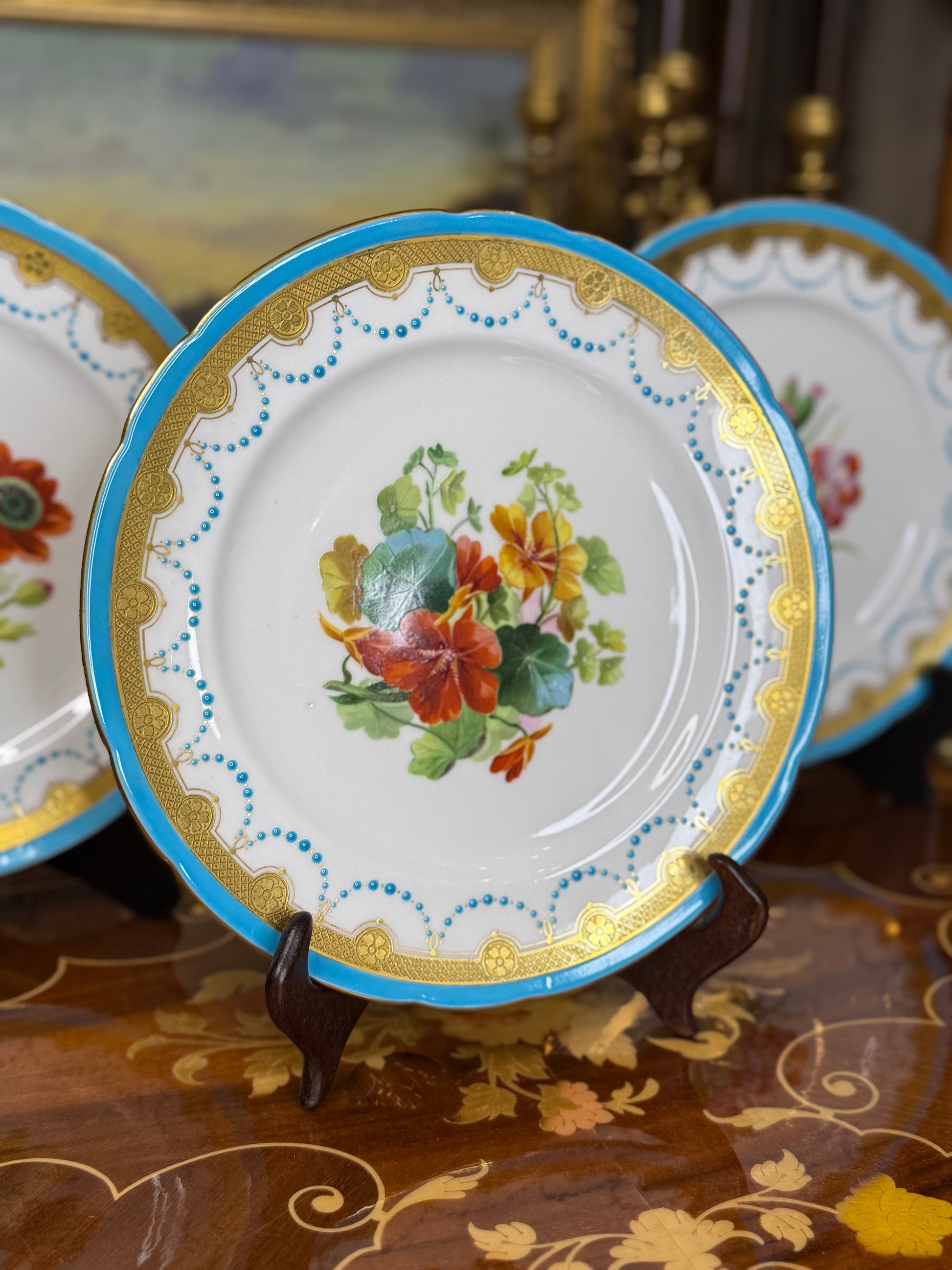 A beautiful set of three Victorian-era Minton dessert plates, each finely hand-painted with vibrant floral studies and finished with exquisite raised jewelling and acid-etched gilding along the border. The rich turquoise rim, ornate gilt detailing, and delicate beaded decoration create a striking frame for the botanical centers, showcasing the exceptional artistry Minton is known for.
