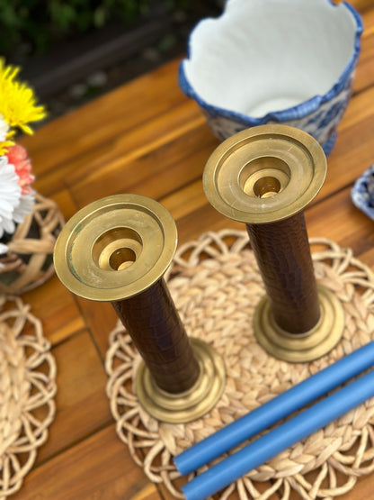 Vintage 10.5" Tall Brass candlesticks, embossed leather wrapped detail