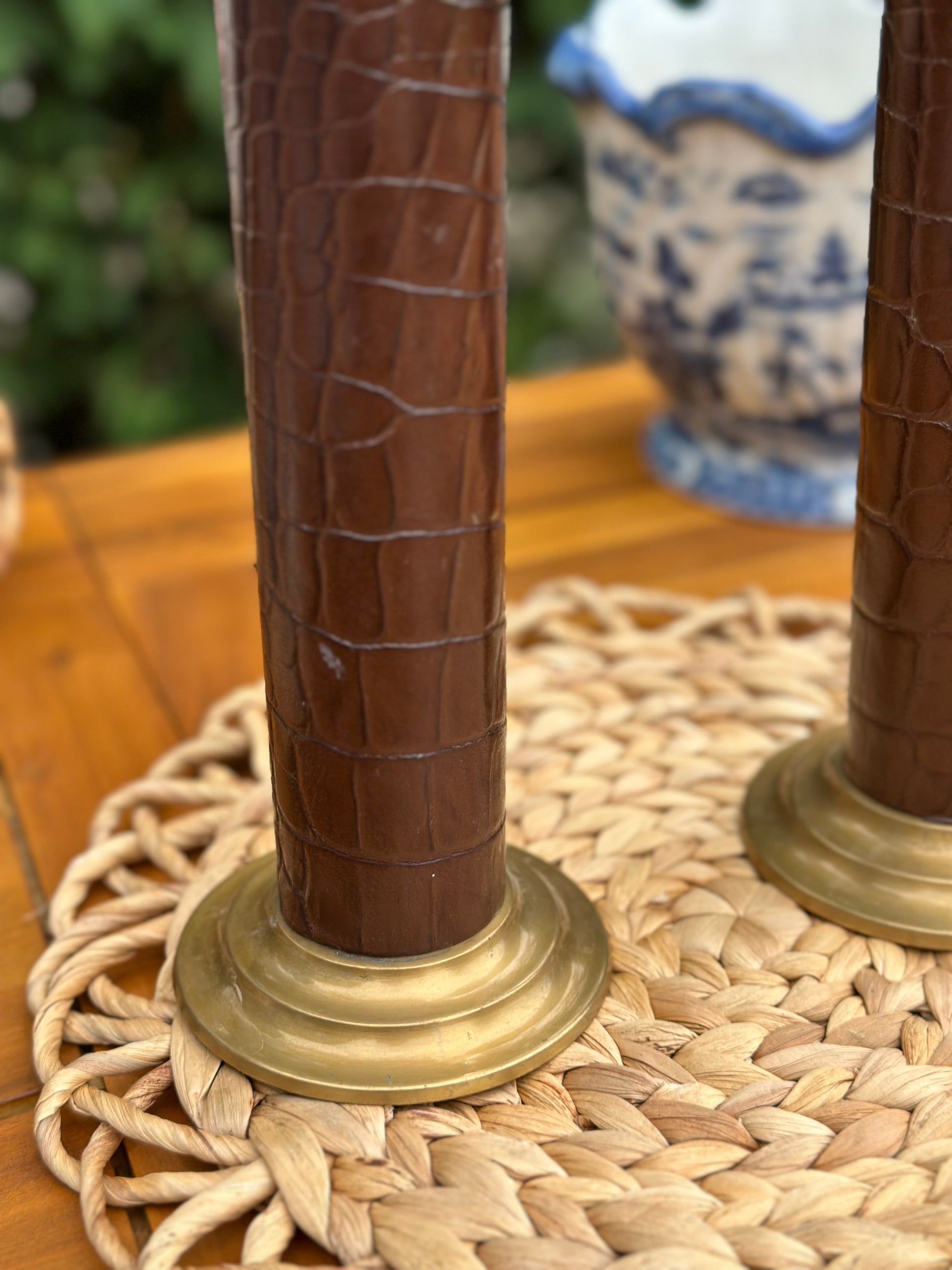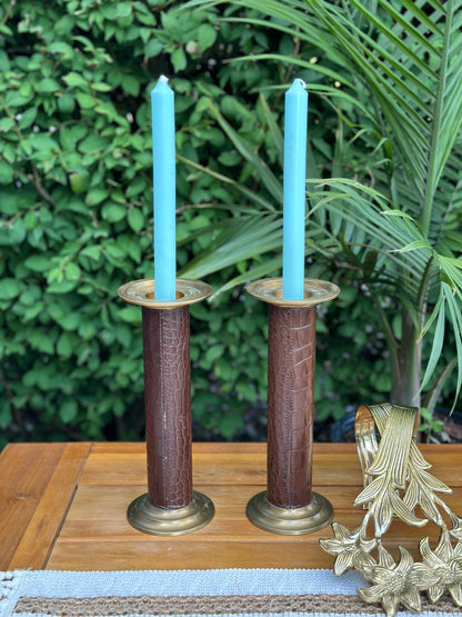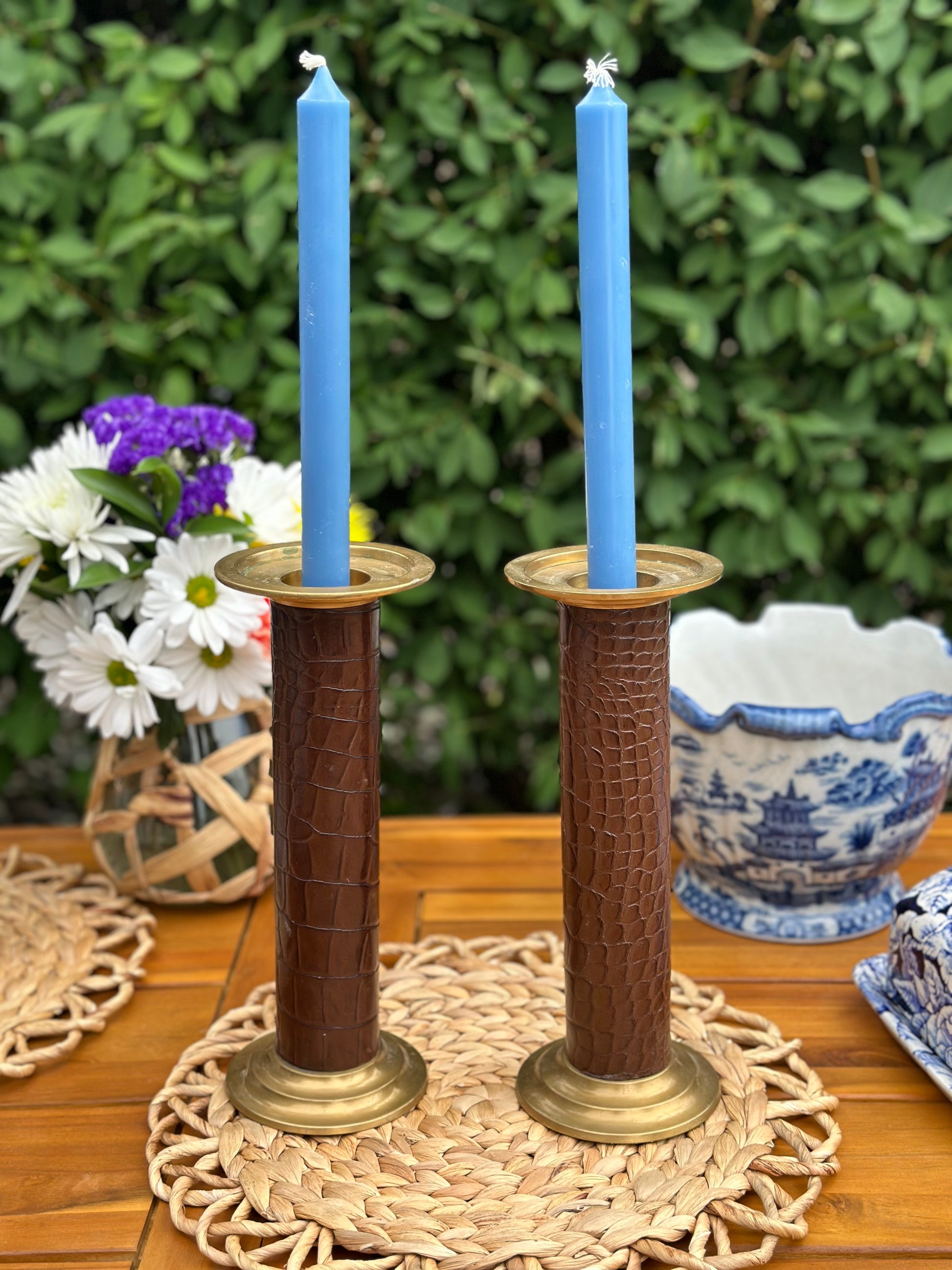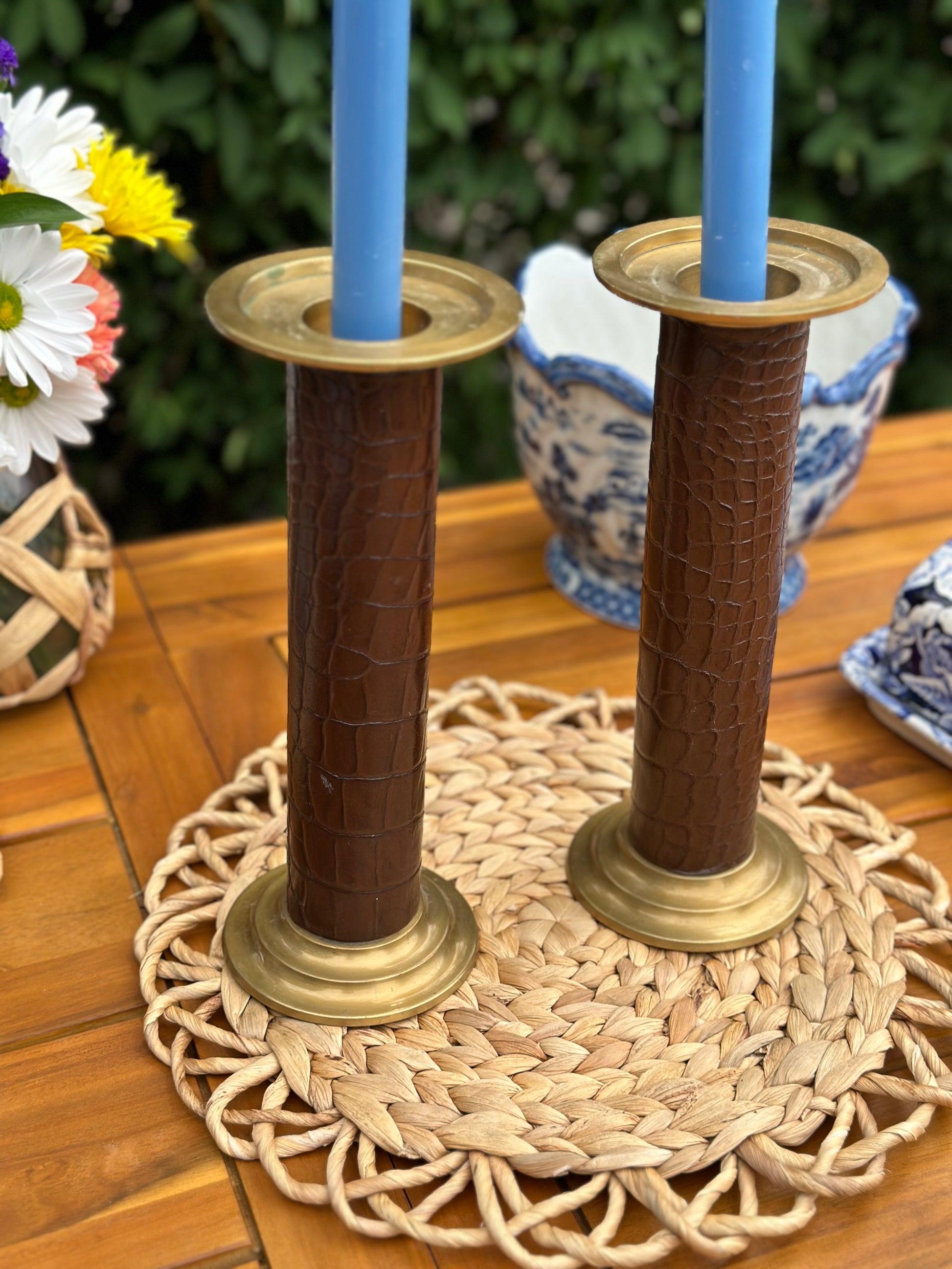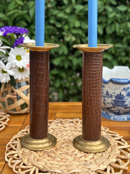 Expertly crafted with vintage brass and elegant embossed leather wrapping, these 10.5" tall candlesticks make the perfect addition to any home decor. Enhance your space with an air of sophistication and add a touch of old-world charm to your ambiance. Very "Ralph Lauren" look to these gorgeous candlesticks!