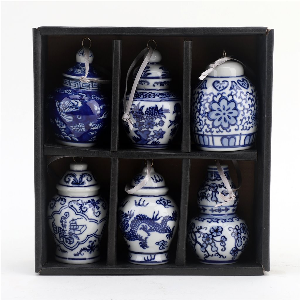 Danny’s Fine Porcelain- (6) Blue & White Chinoiserie Jars Porcelain Ornament Set, 3.5" Tall