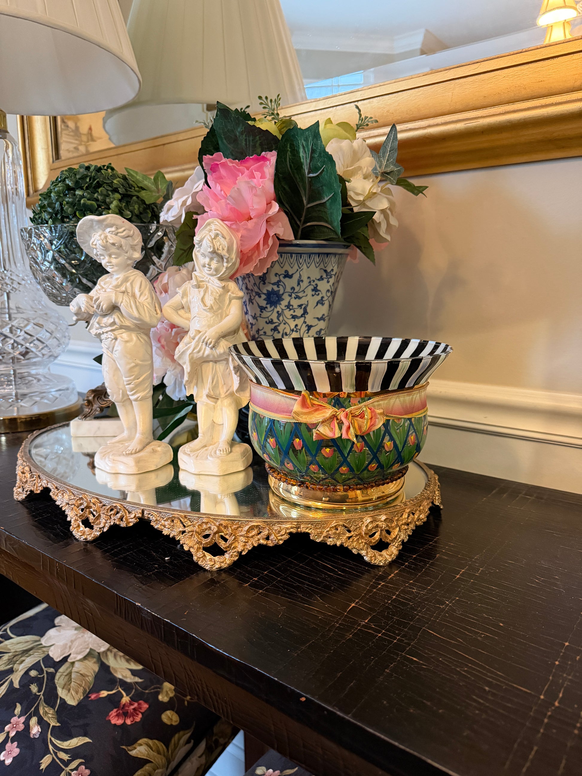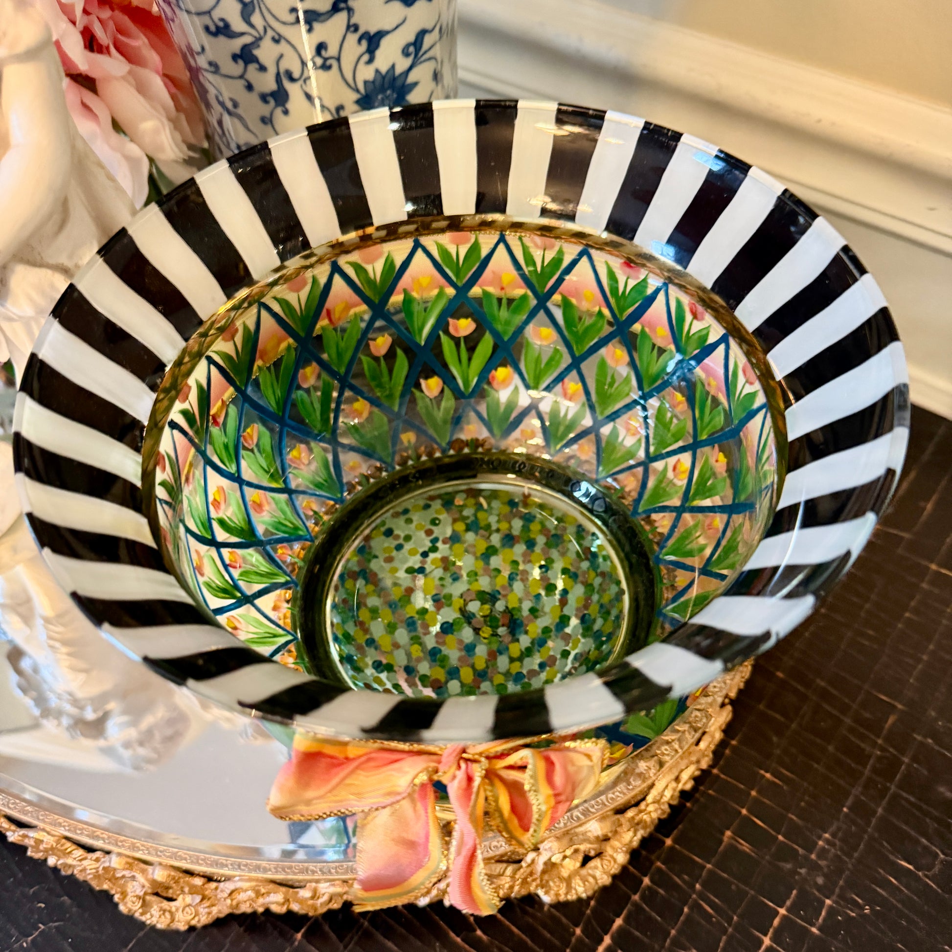 Vintage Painted glass faux MacKenzie-Childs Inspired black/white botanical painted vase 8 x 5.5