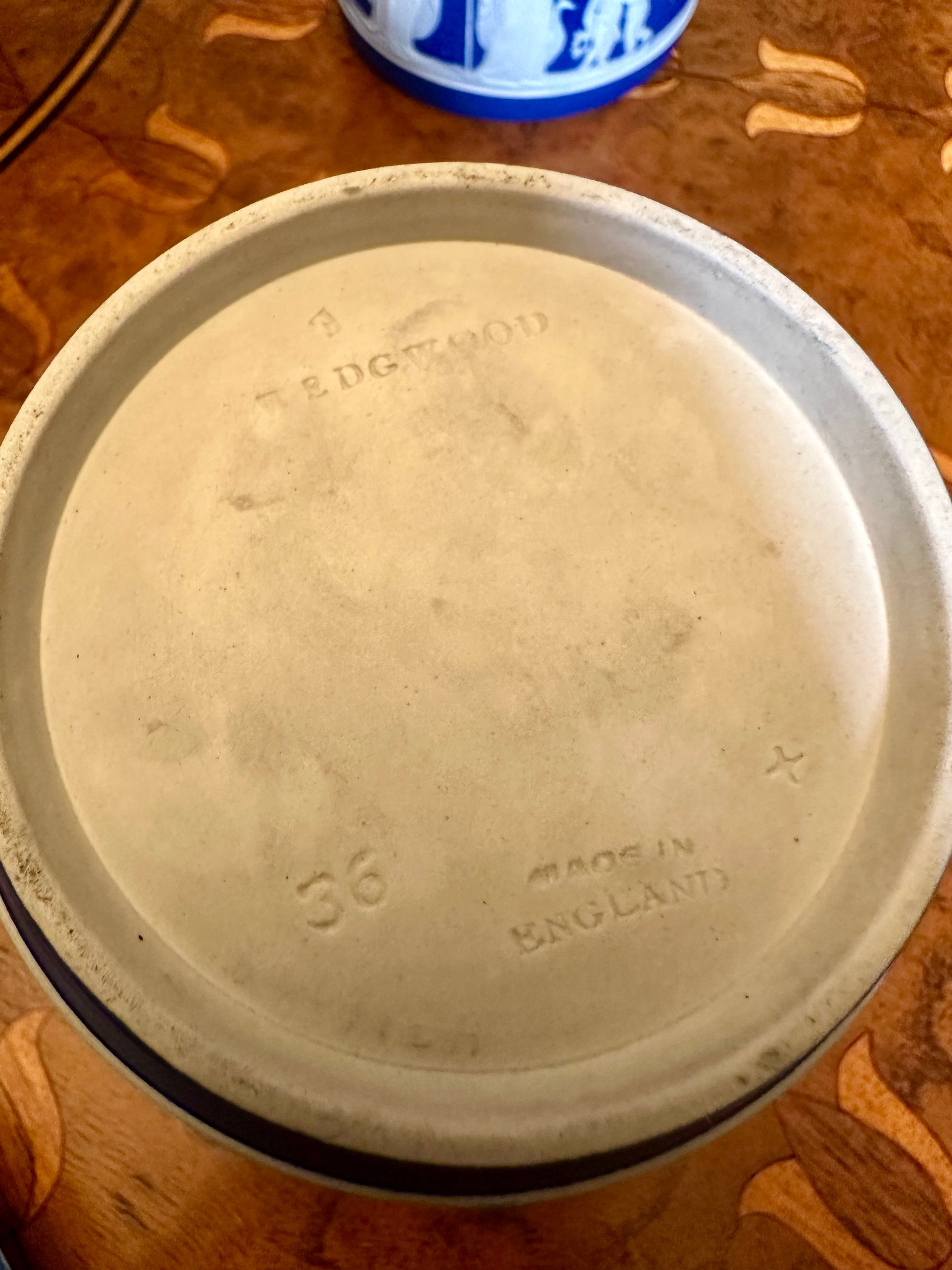 A refined vintage Wedgwood jasper dip creamer, also known as a Dutch jug, dating to circa 1936. The form is decorated with crisp white bas relief set against a deep cobalt blue ground, reflecting Wedgwood’s signature neoclassical style. The underside is impressed “WEDGWOOD,” “MADE IN ENGLAND,” along with “E” and “36” marks, accurately dating the piece to 1936. Condition is excellent, with no chips or cracks and only slight surface wear consistent with age and careful use. A versatile and collectible object—ideal as a creamer, a small vase, or as part of a curated jasperware display.