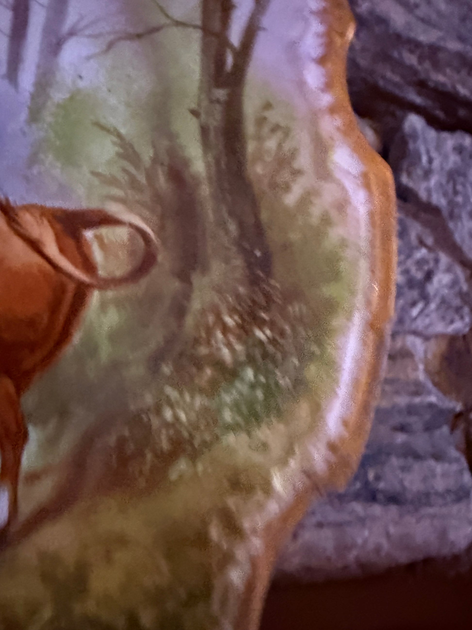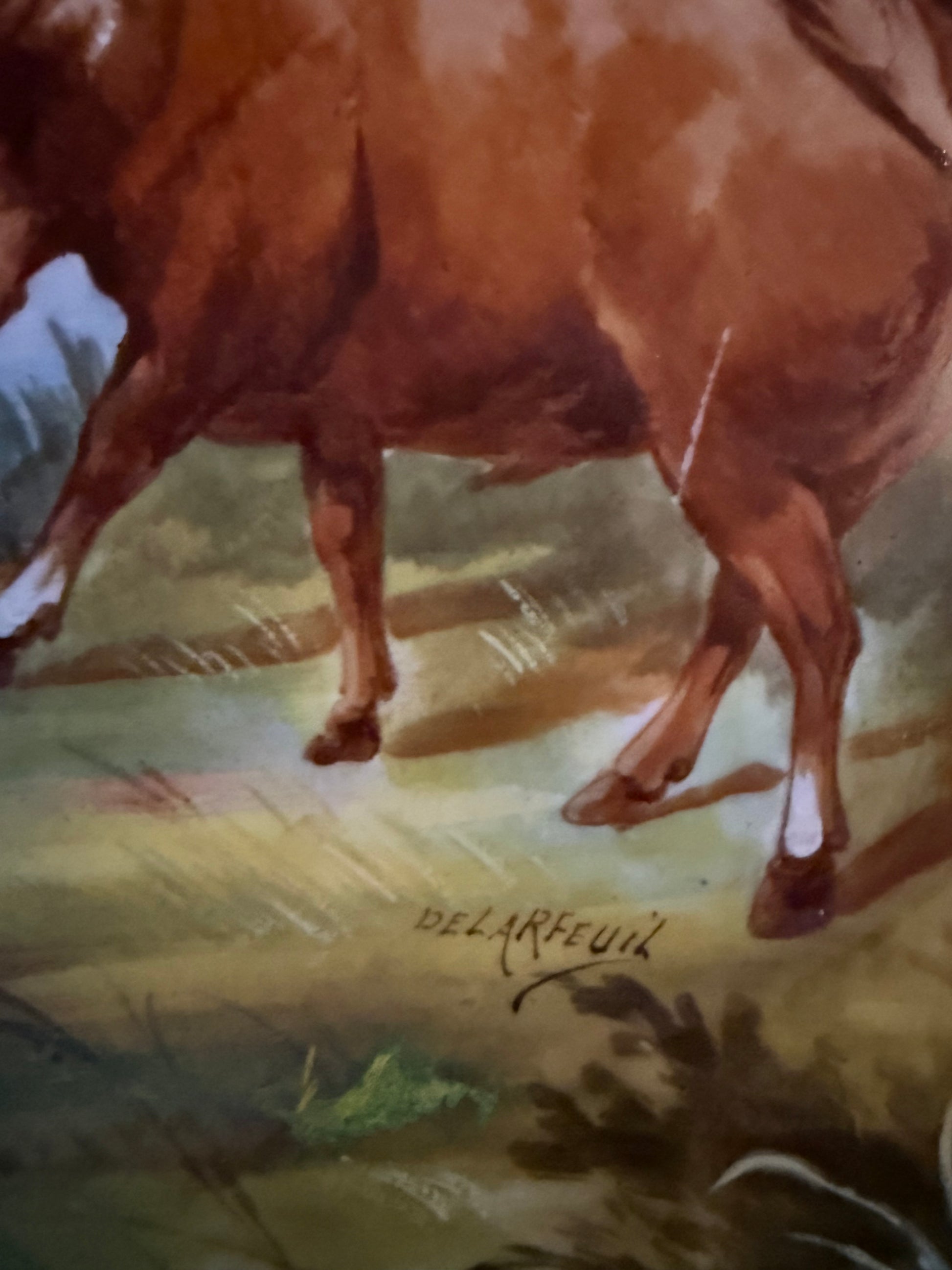The repair is visible from the back but well disguised on the front. Overall displays beautifully. One light scratch on the cow as shown in photos. Measures approximately 11”.