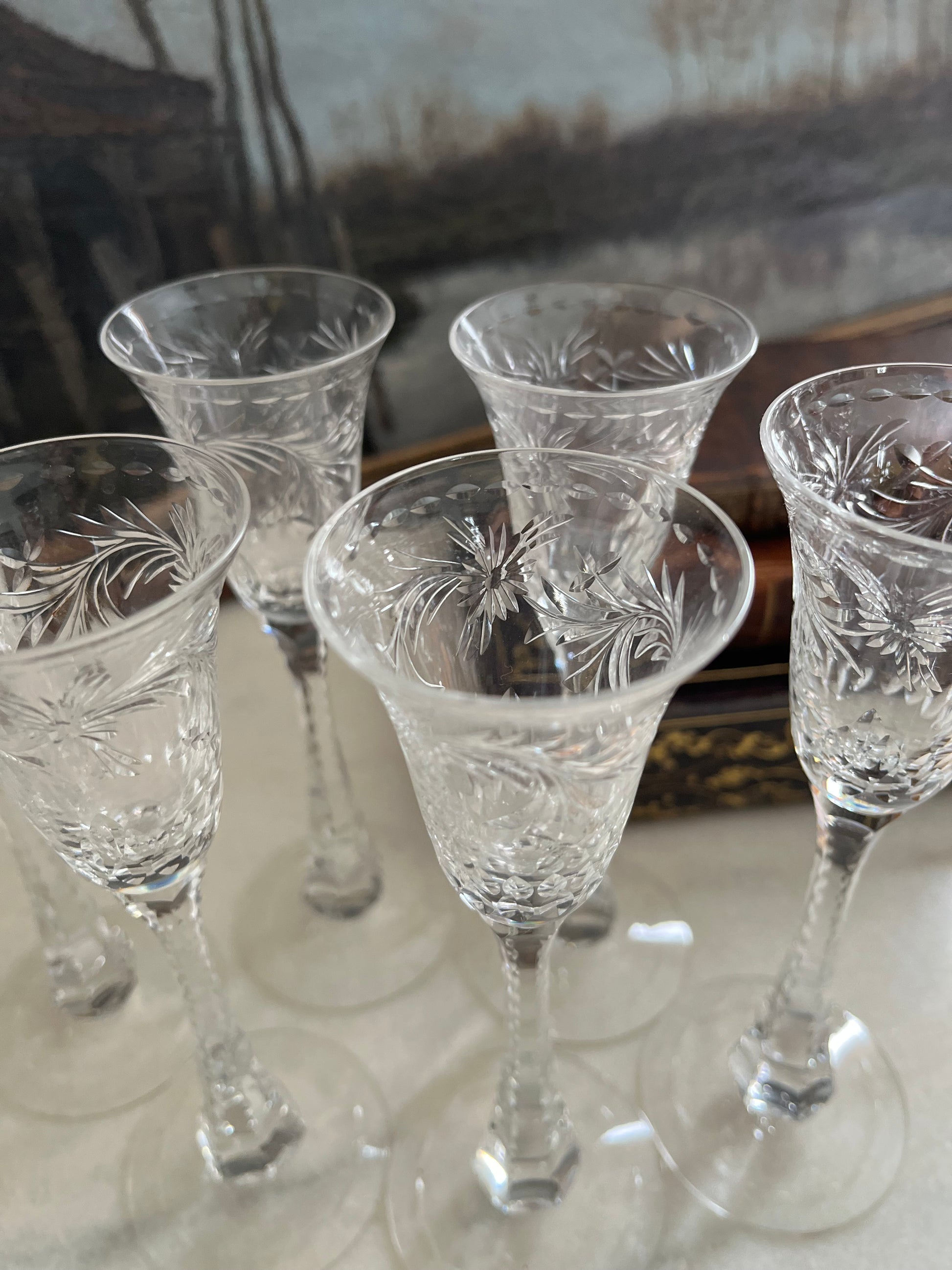 These are not everyday glasses — they are signed Hawkes, beautifully brilliant cut, and balanced on those graceful, elongated stems that catch candlelight like diamonds. The bowls are intricately cut with crisp precision, giving that unmistakable sparkle of Guilded Age Edwardian elegance.