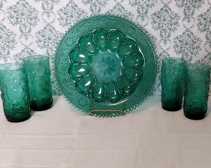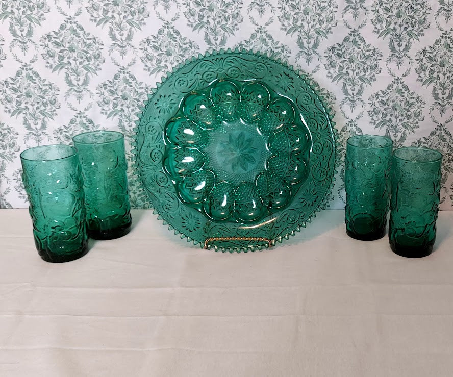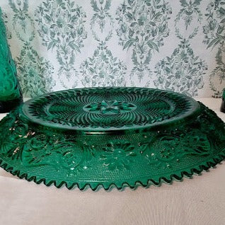 This Green Egg platter by Indiana Glass is perfect for creating a beautiful presentation. The Tiara pattern Sandwich Glass creates a stunning visual effect, while the 12" size makes it a perfect centerpiece for a meal.