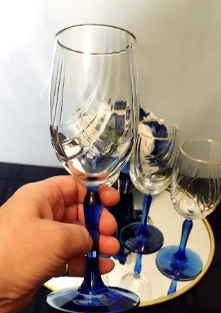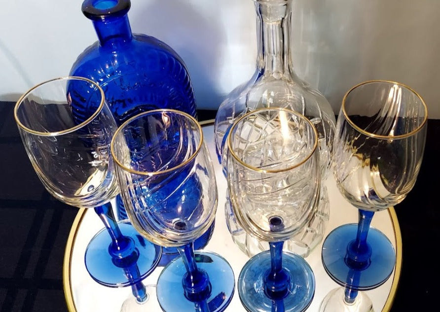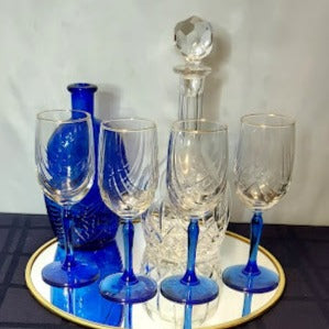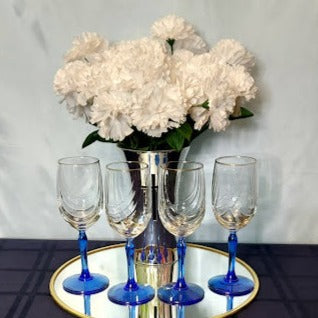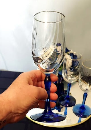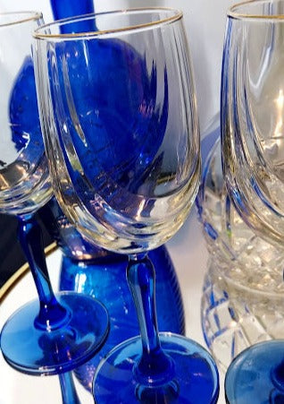 Enhance your next celebration with this exquisite set of four cobalt blue stem wine glasses. Crafted by Lenox, each glass features a gold rim and a dual draped swag for a look that's elegant and sophisticated. The vintage feel adds a classic touch, while the 5.25" height and 2.75" width offer a refined and luxurious experience. Enjoy the finer moments of life with these exquisite stem wine glasses.