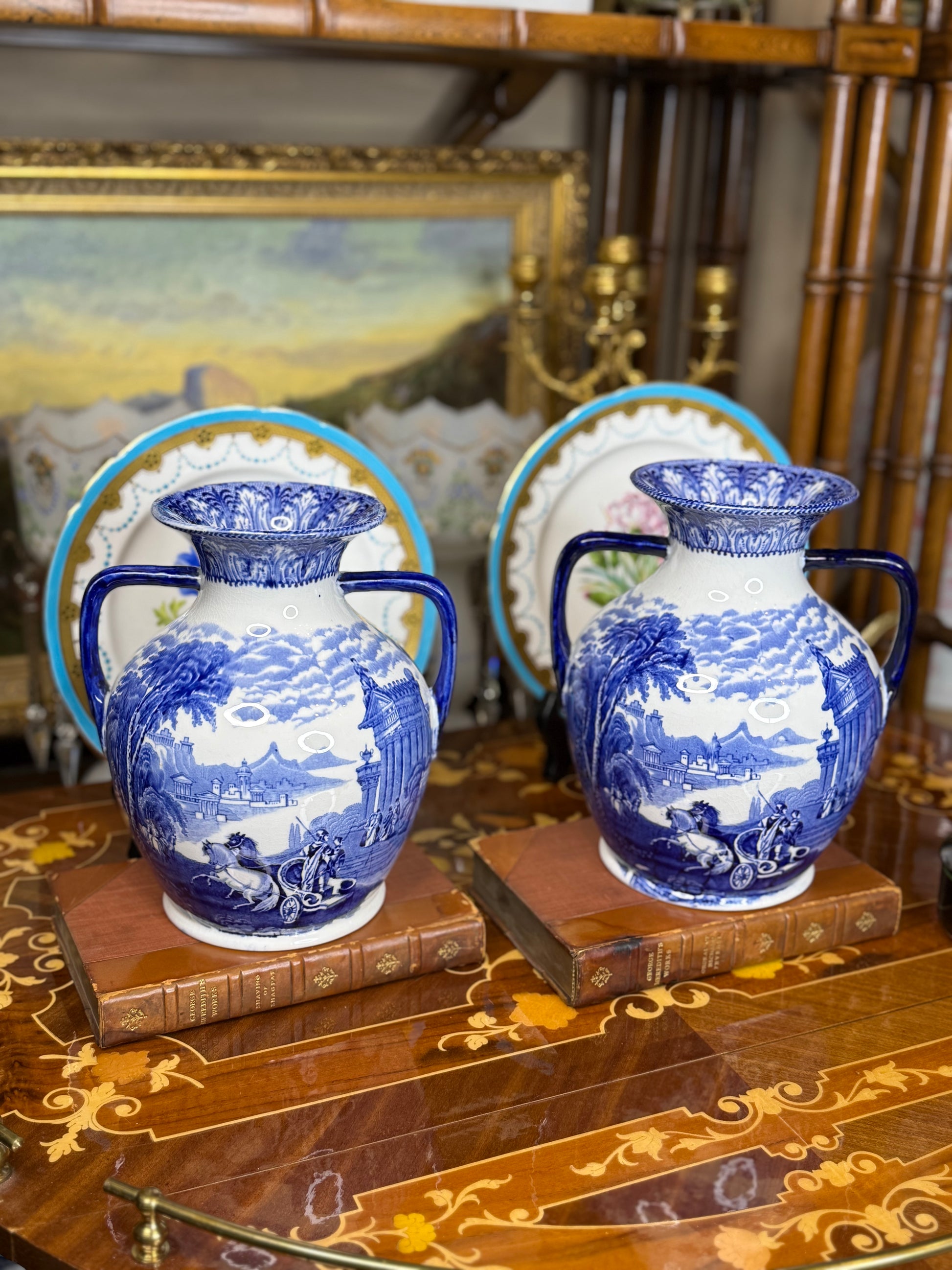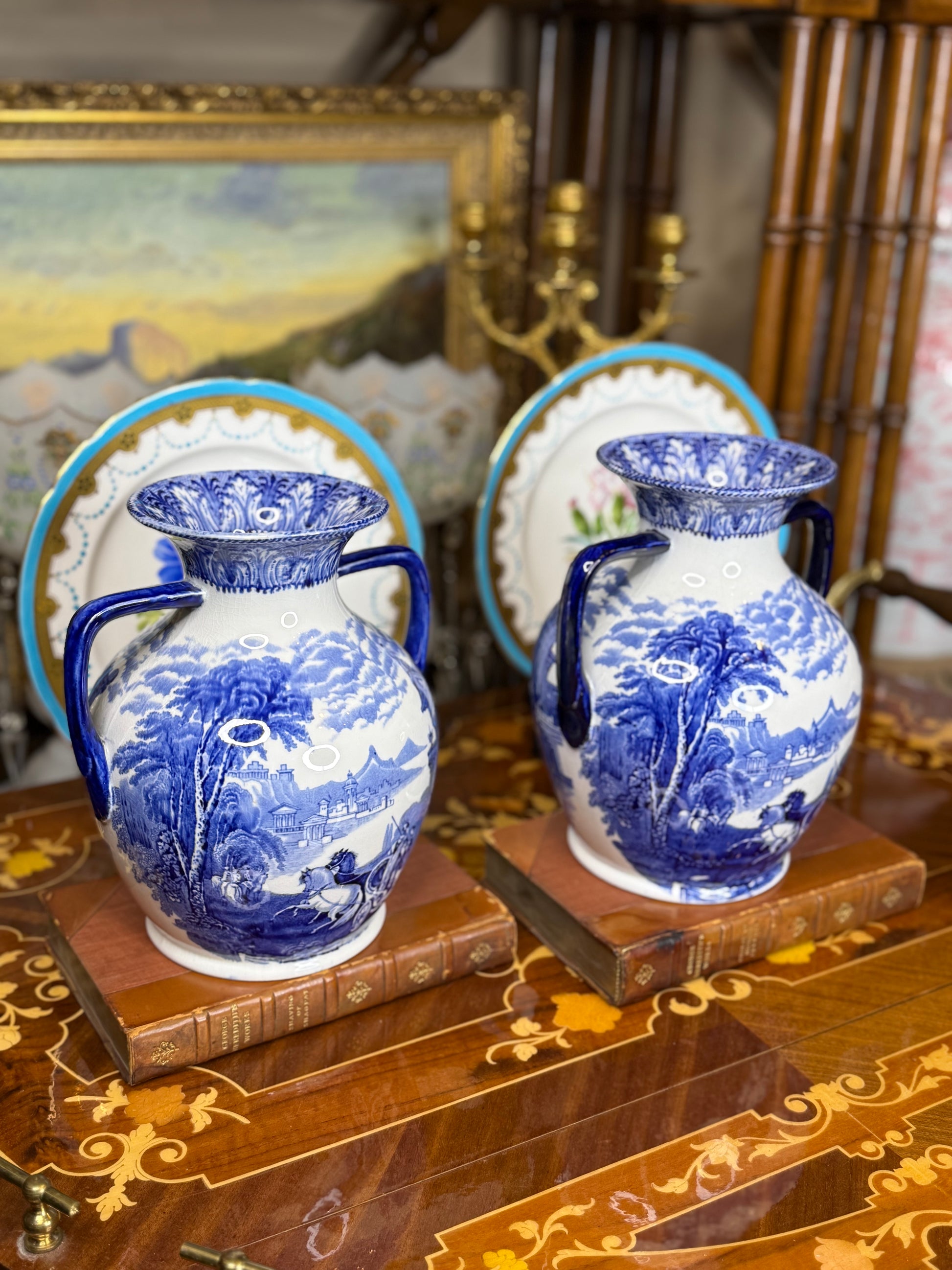 The sculptural Portland form, with flared rim and elegant twin handles, makes these vases striking as a pair on a mantel, console, or bookshelf. Their crisp cobalt decoration and balanced proportions bring instant old-world style to any interior—perfect for collectors of English blue-and-white or classic transferware forms.