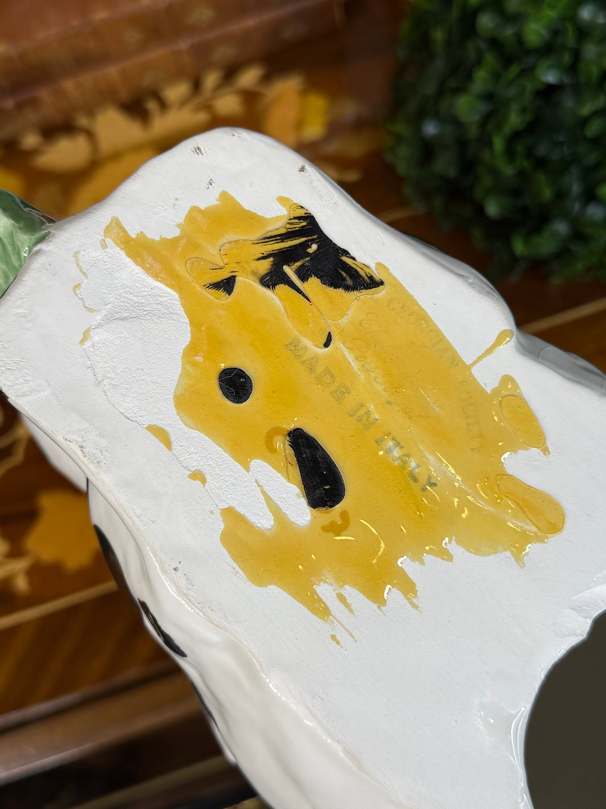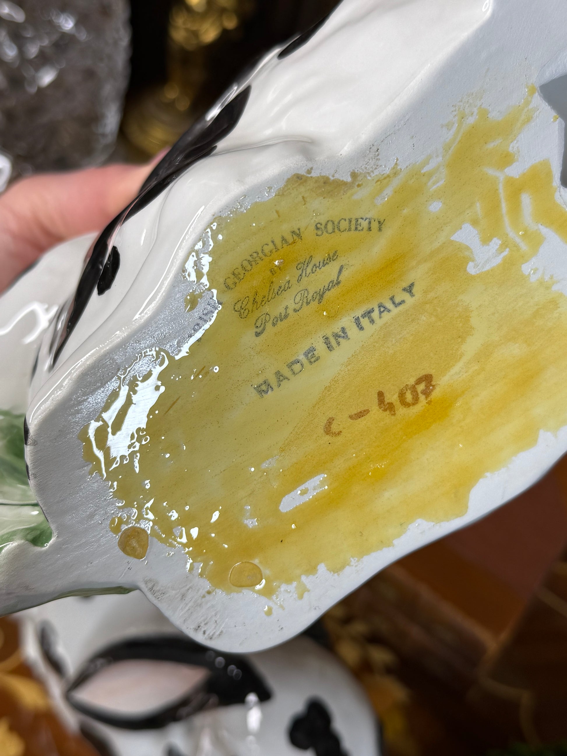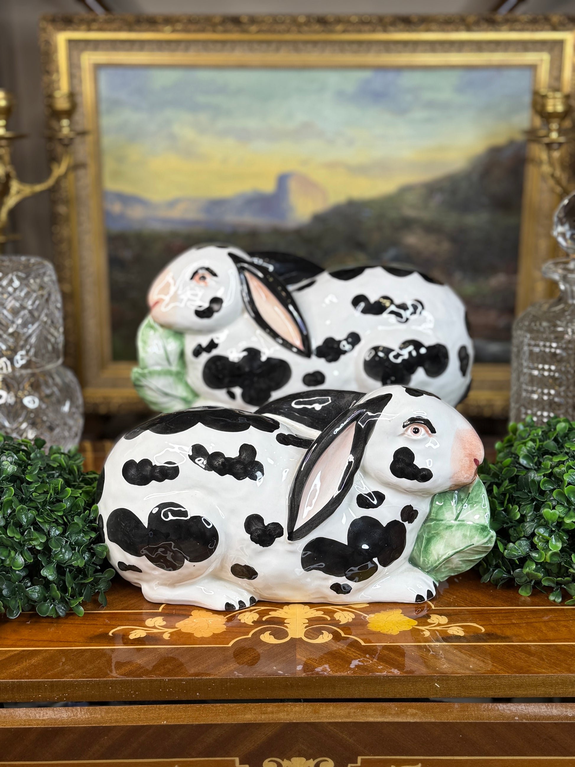 An absolutely charming pair of Italian ceramic rabbit figurines by the Georgian Society, each hand-painted in classic black and white with sweet, expressive faces and a leafy green accent. These whimsical bunnies are beautifully scaled and make a delightful decorative statement on a mantel, bookshelf, console, or in a spring tablescape.