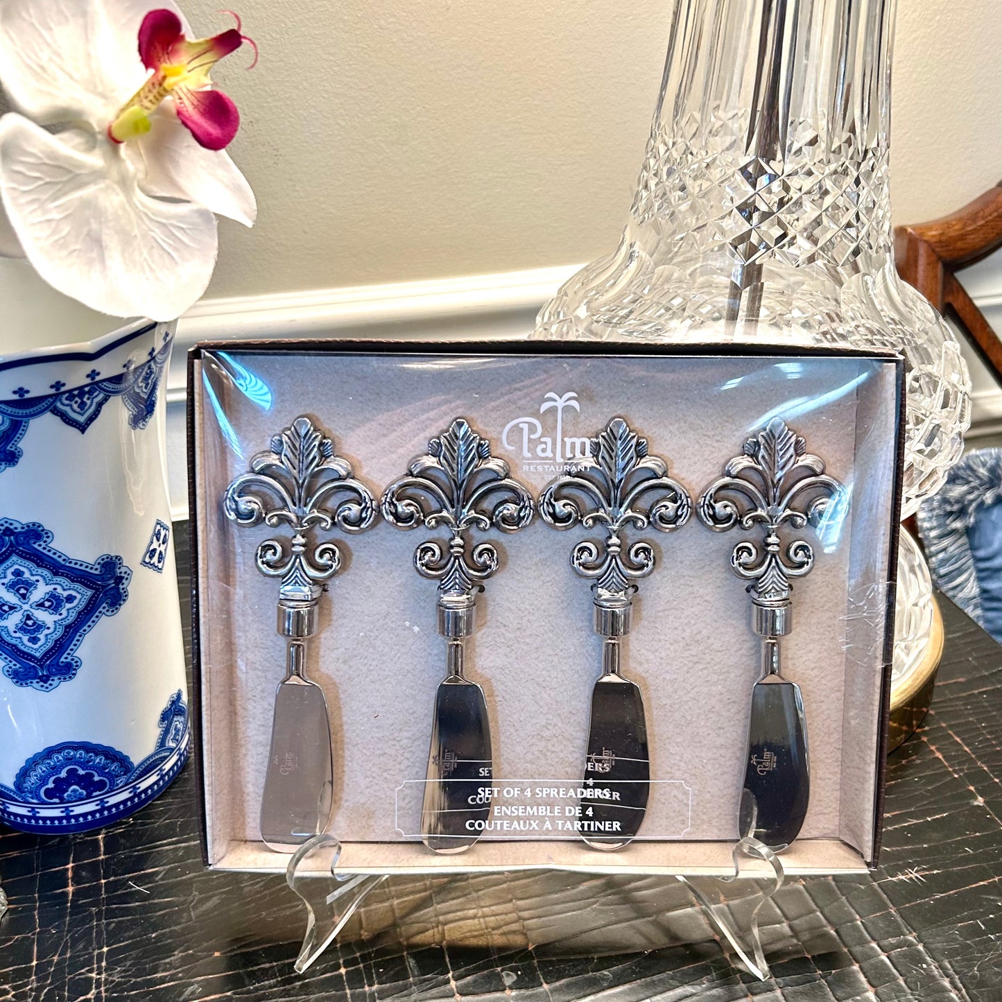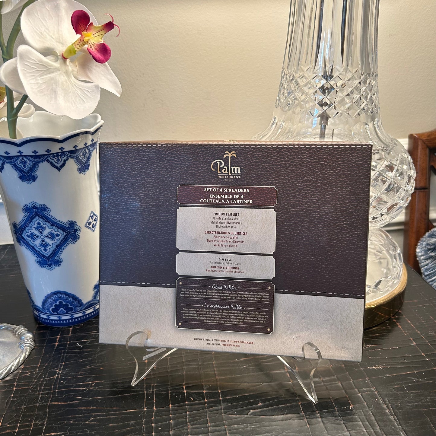 set of New in box silver stainless cheese knives or spreaders for Palm steakhouse . New in the box! Very chic and ready for entertaining