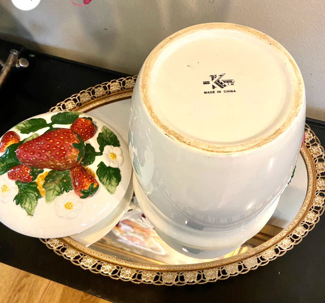 - Absolutely adorable large majolica style strawberry cookie jar with lid