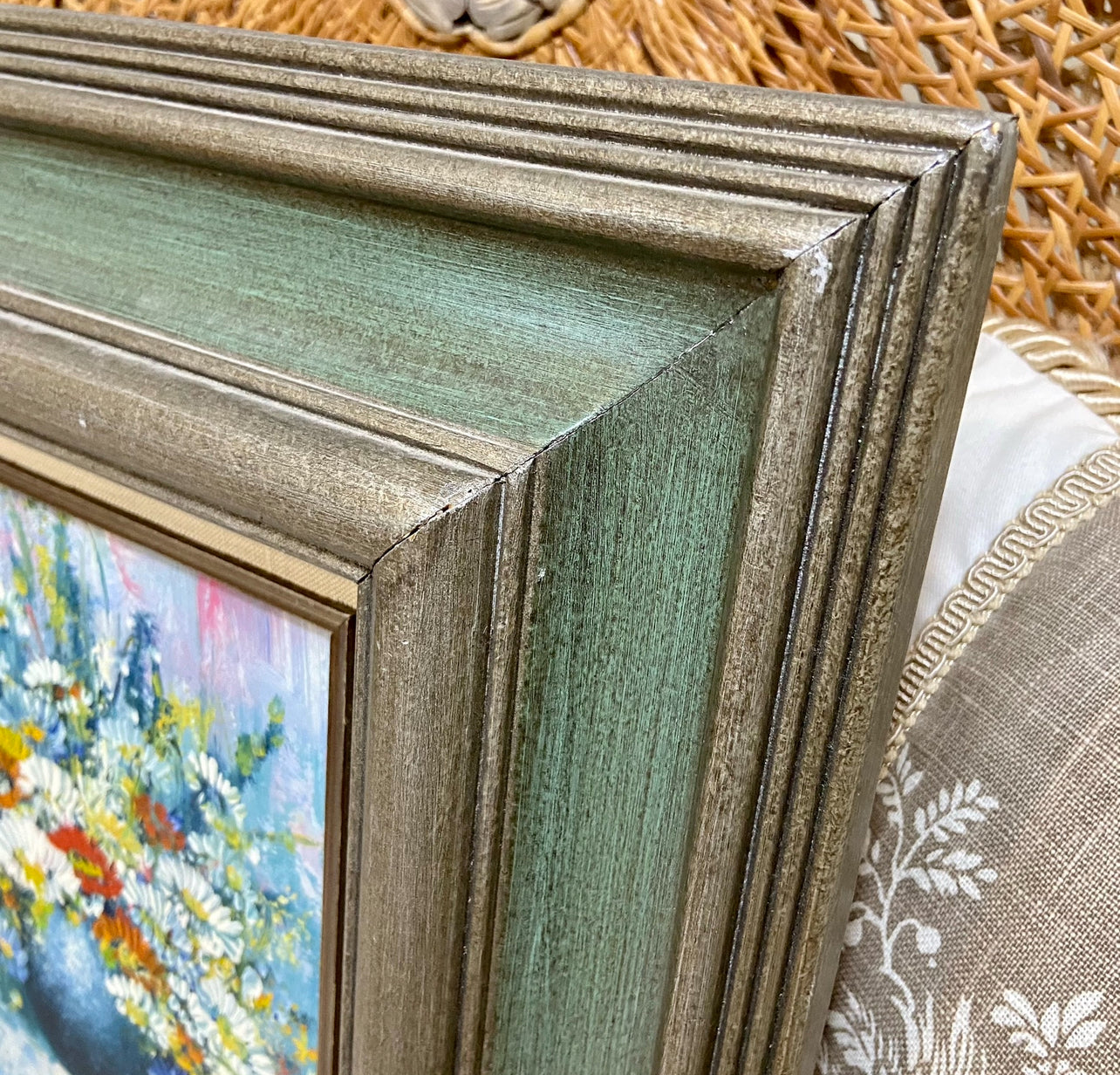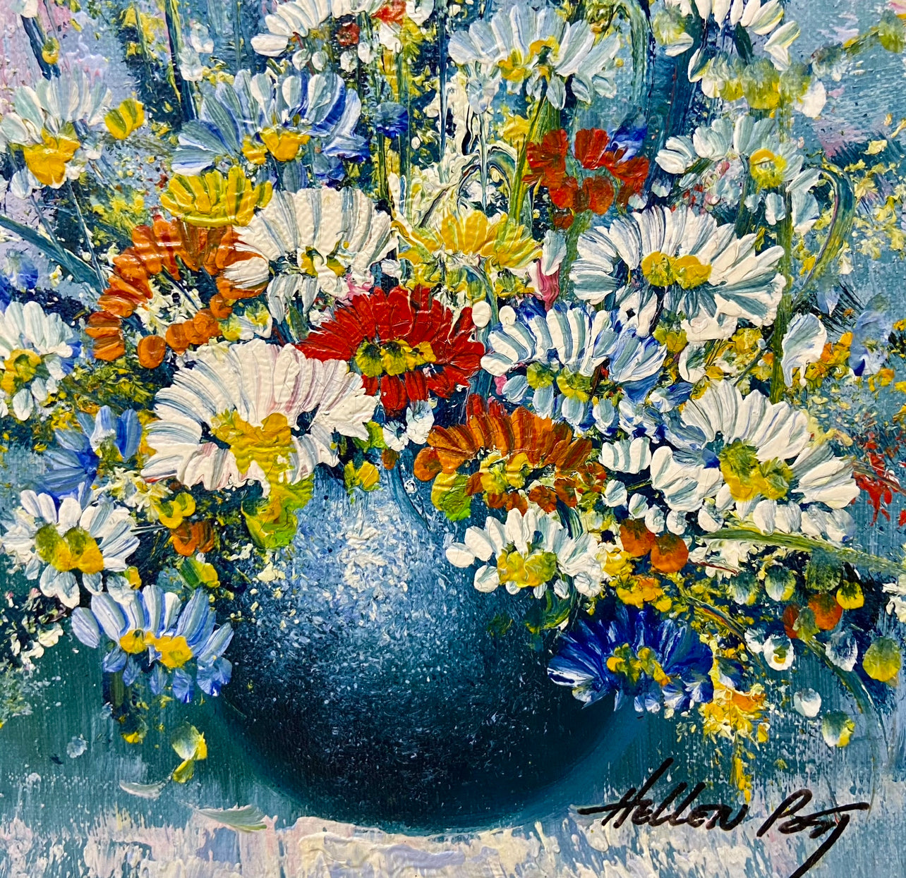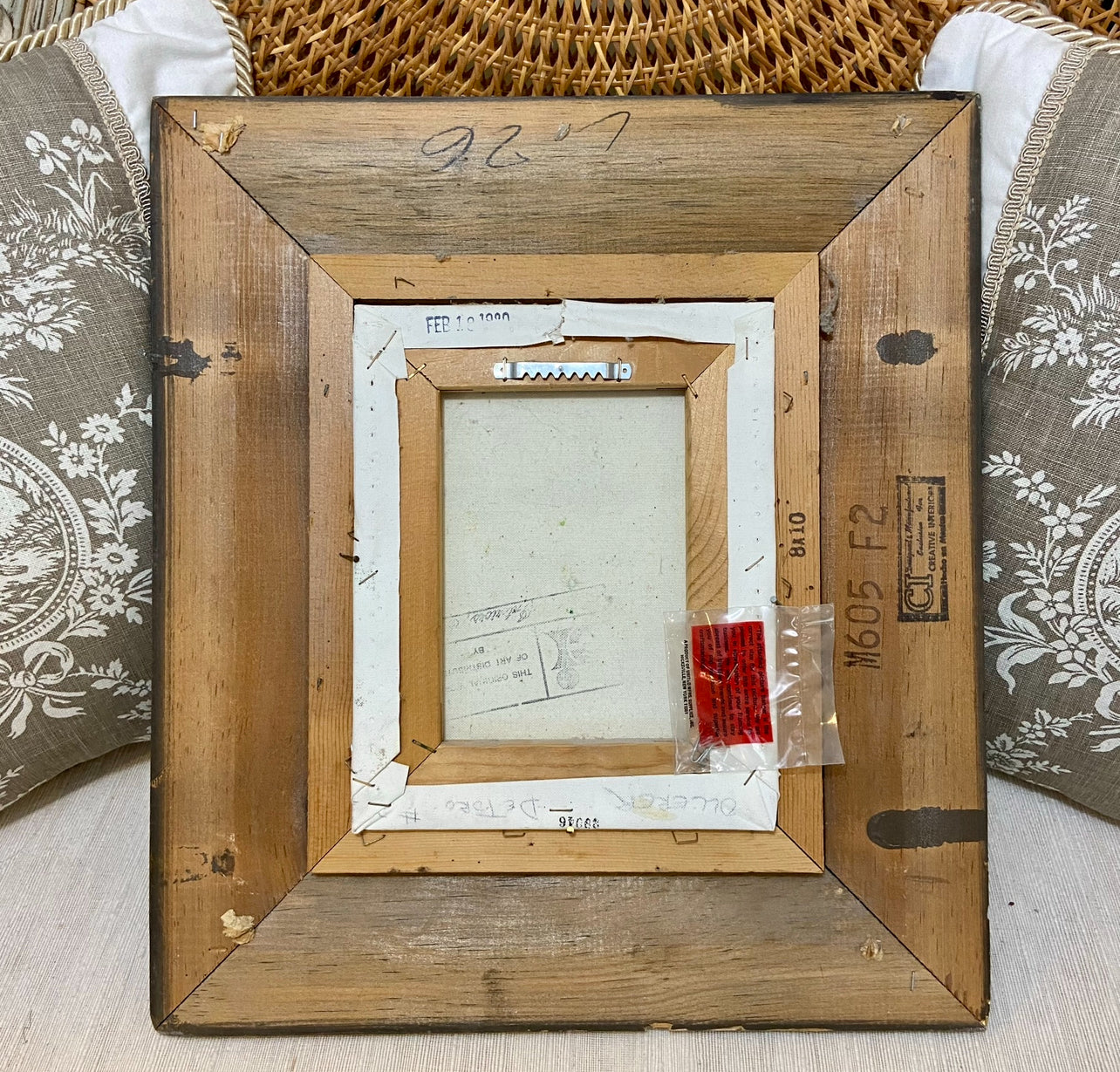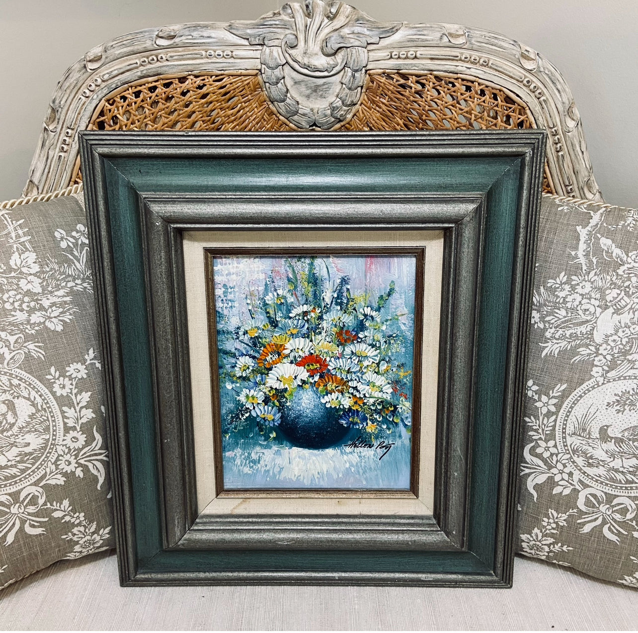 This vintage signed original oil painting by artist Hellen Post features a sunny color palette and comes framed in wood. Measuring 18 x 16 inches, it is a beautiful piece.