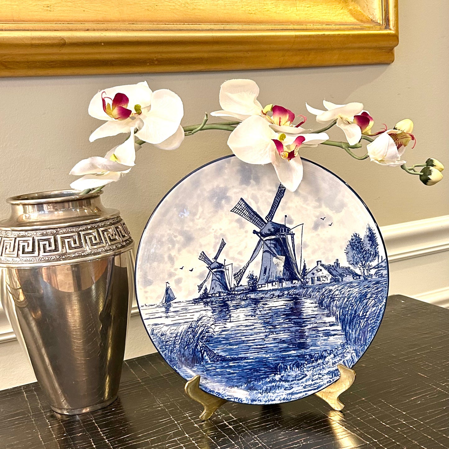 Delightful Delft Windmill hand painted vintage blue and white plate