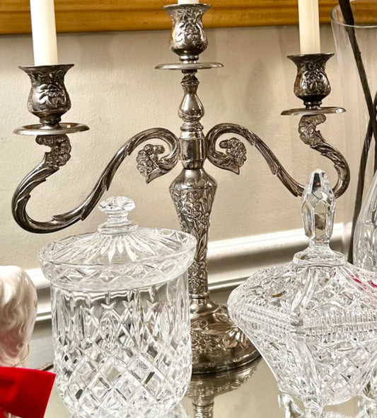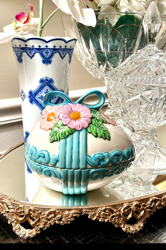 Whimsical vintage bow basketweave floral large lidded jar centerpiece.