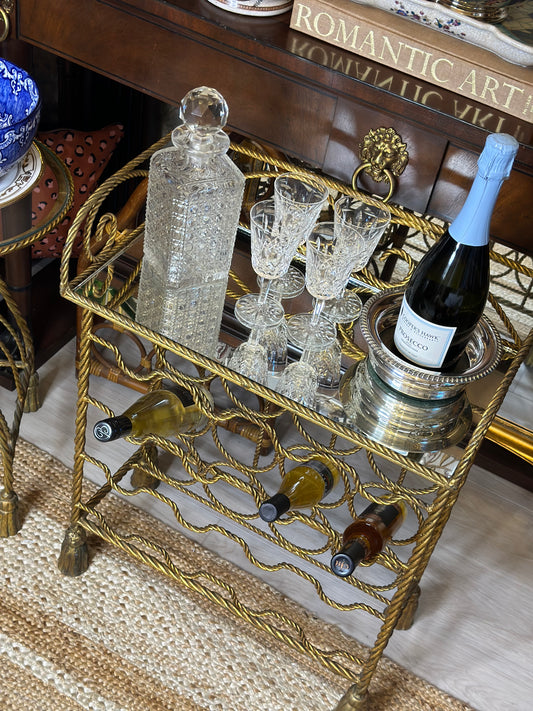 Vintage Gold-Gilt Hollywood Regency, Metal Rope, Mirror Top Wine Table - Excellent!