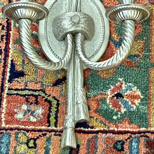Pair Hollywood Regency style silver Tassel hard wired light sconces.