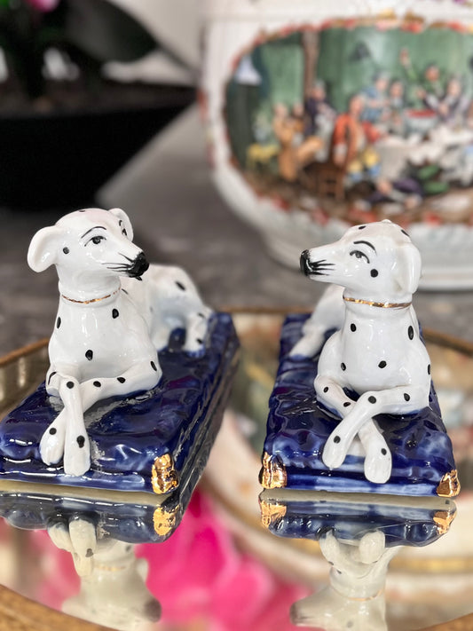 Fitz & Floyd Dalmatian Pup Figurine Pair – Porcelain Dogs on Gilded Cobalt Blue Cushions
