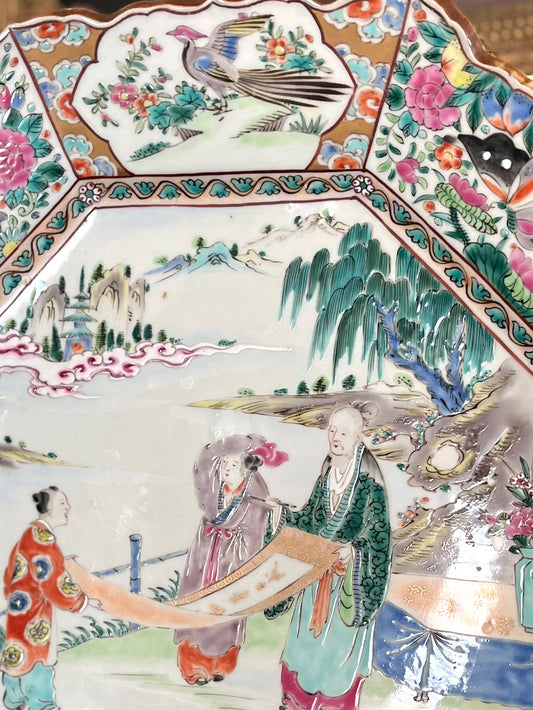 Luxe 19th Century Chinese Export Rose Medallion Porcelain Scalloped Large Charger, Rare Octagonal Form, Collector Accent