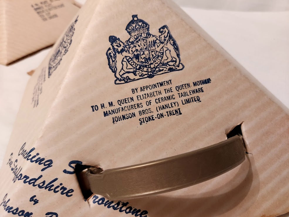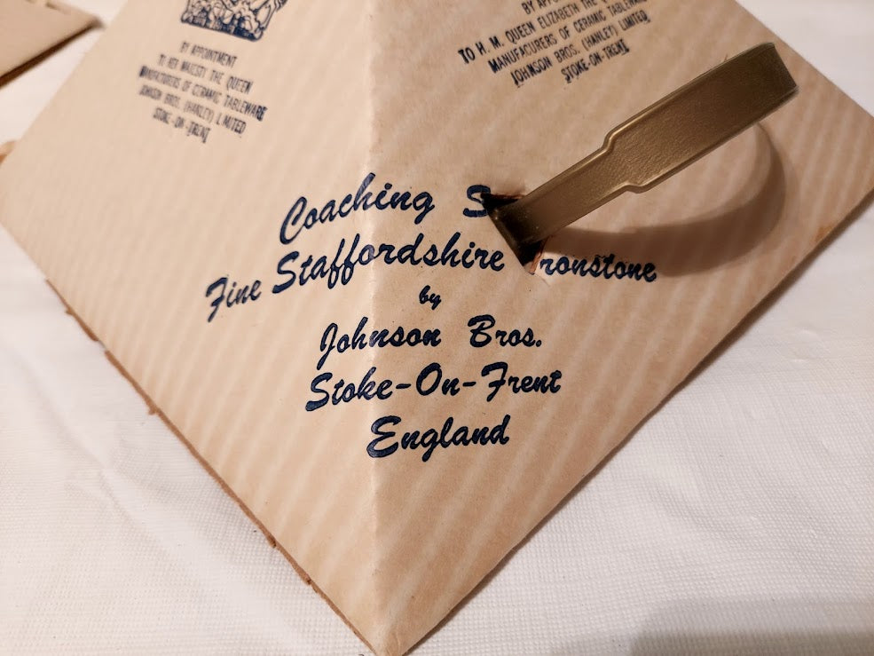 This 16 piece porcelain set by Johnson Brothers features a beautiful blue and white design with a classic coaching scene. Made in Stoke on Trent, England, these dishes are crafted with fine Staffordshire Ironstone. Perfect for a dinner party, this set includes 4 of each item and comes with its original boxes. Elevate your dining experience with this elegant and timeless set. 2 of the dinner plates show crazing. All other pieces are in excellent condition. See photos. Sold As Is.
