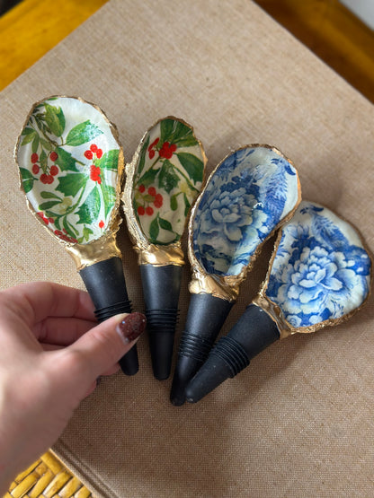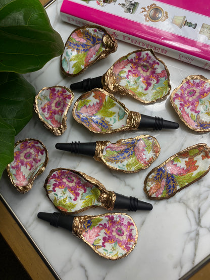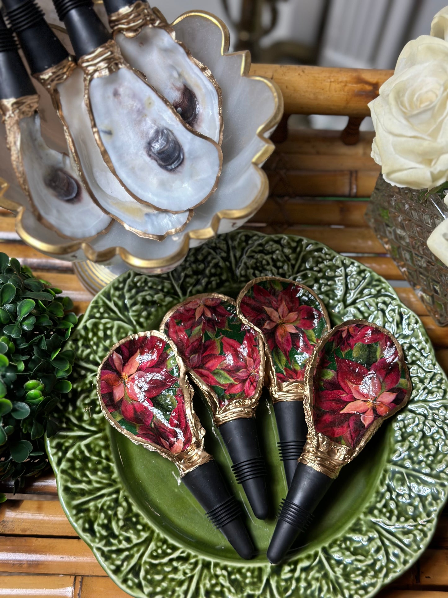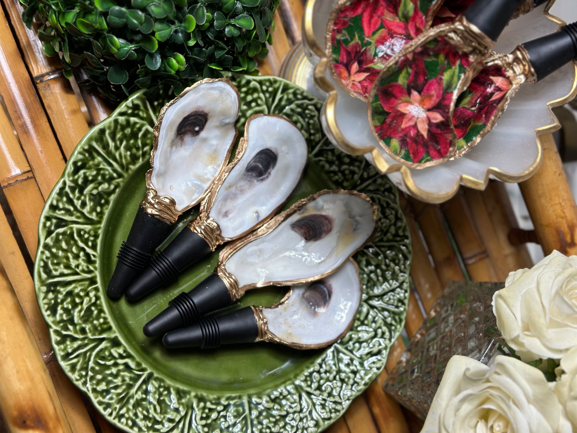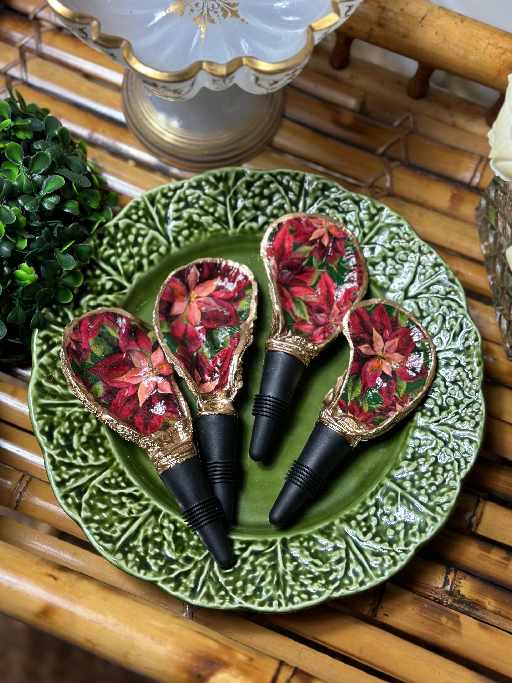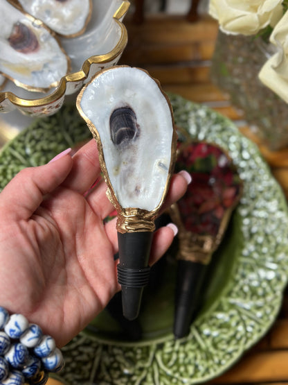 Handmade in SC from real oysters! These are washed, polished and gold-gilded with love in the USA. Each oyster varies in size from 2-3” long + the 2" long rubber stopper. Great hostess gift or stocking stuffer. Choose from natural or our latest Poinsettia floral one for the holidays!