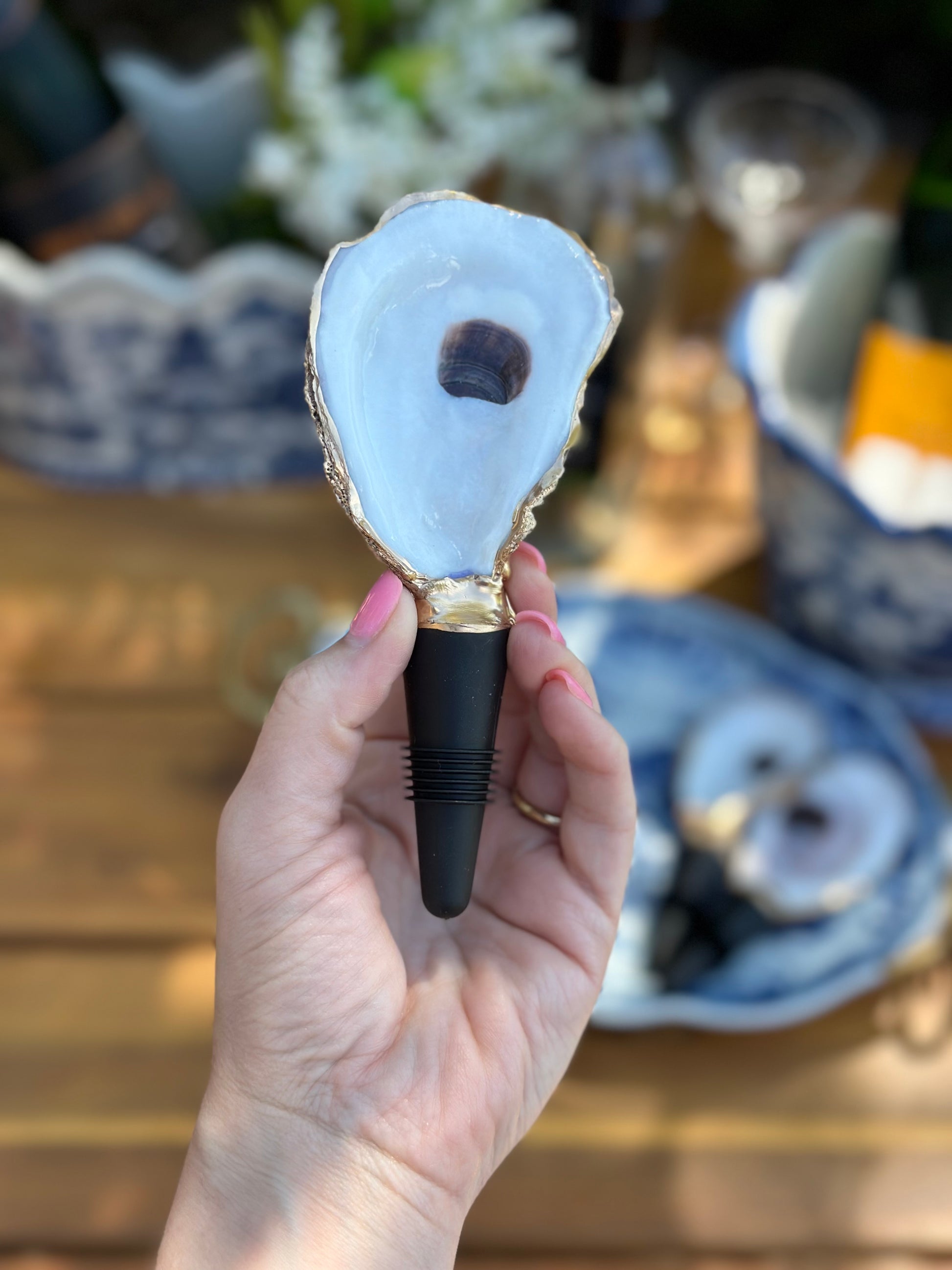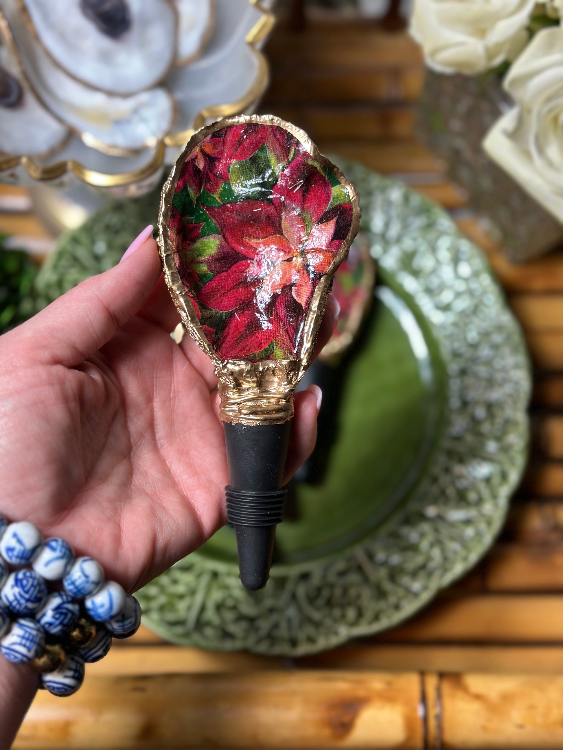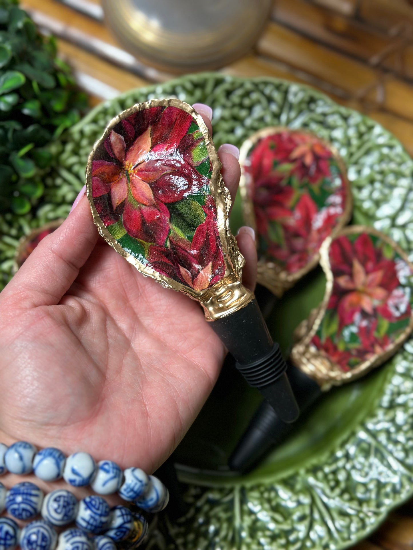 Handmade in SC from real oysters! These are washed, polished and gold-gilded with love in the USA. Each oyster varies in size from 2-3” long + the 2" long rubber stopper. Great hostess gift or stocking stuffer. Choose from natural or our latest Poinsettia floral one for the holidays!