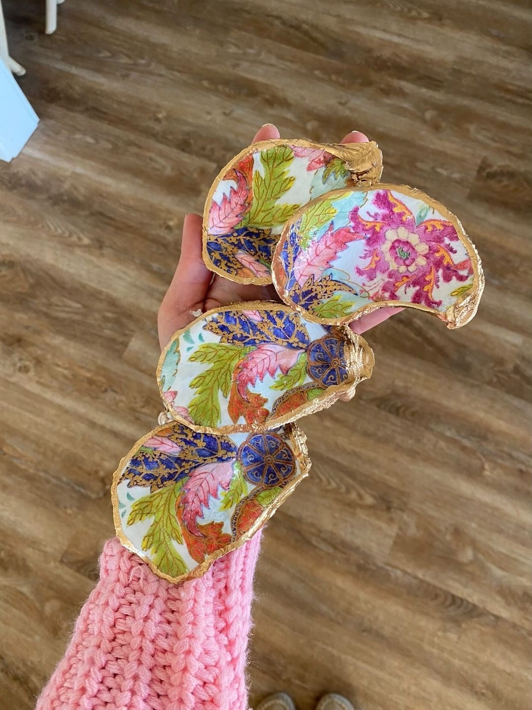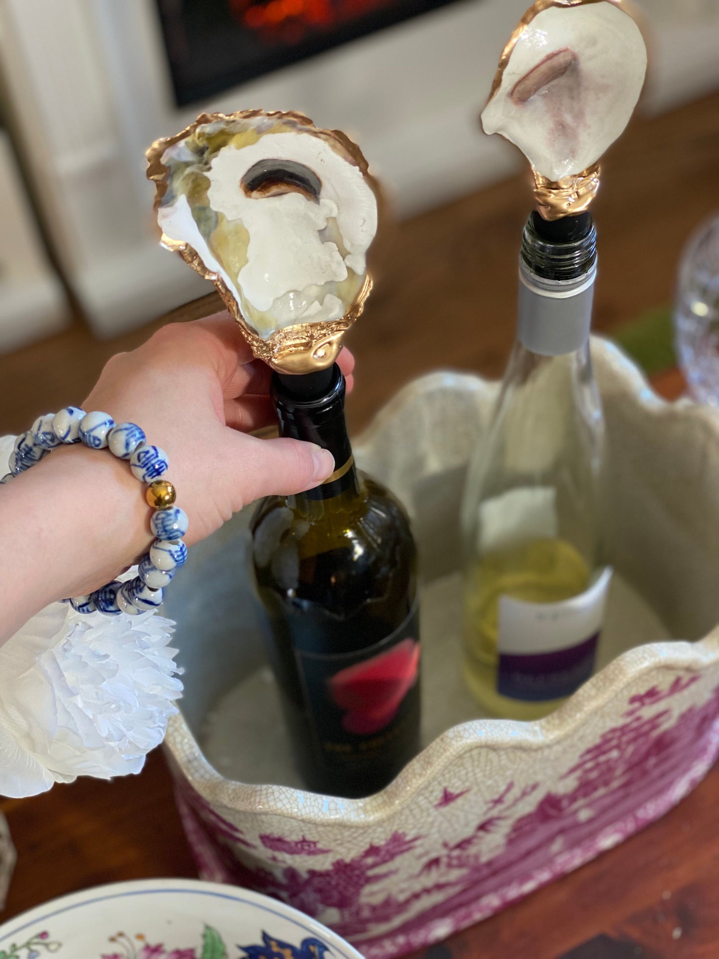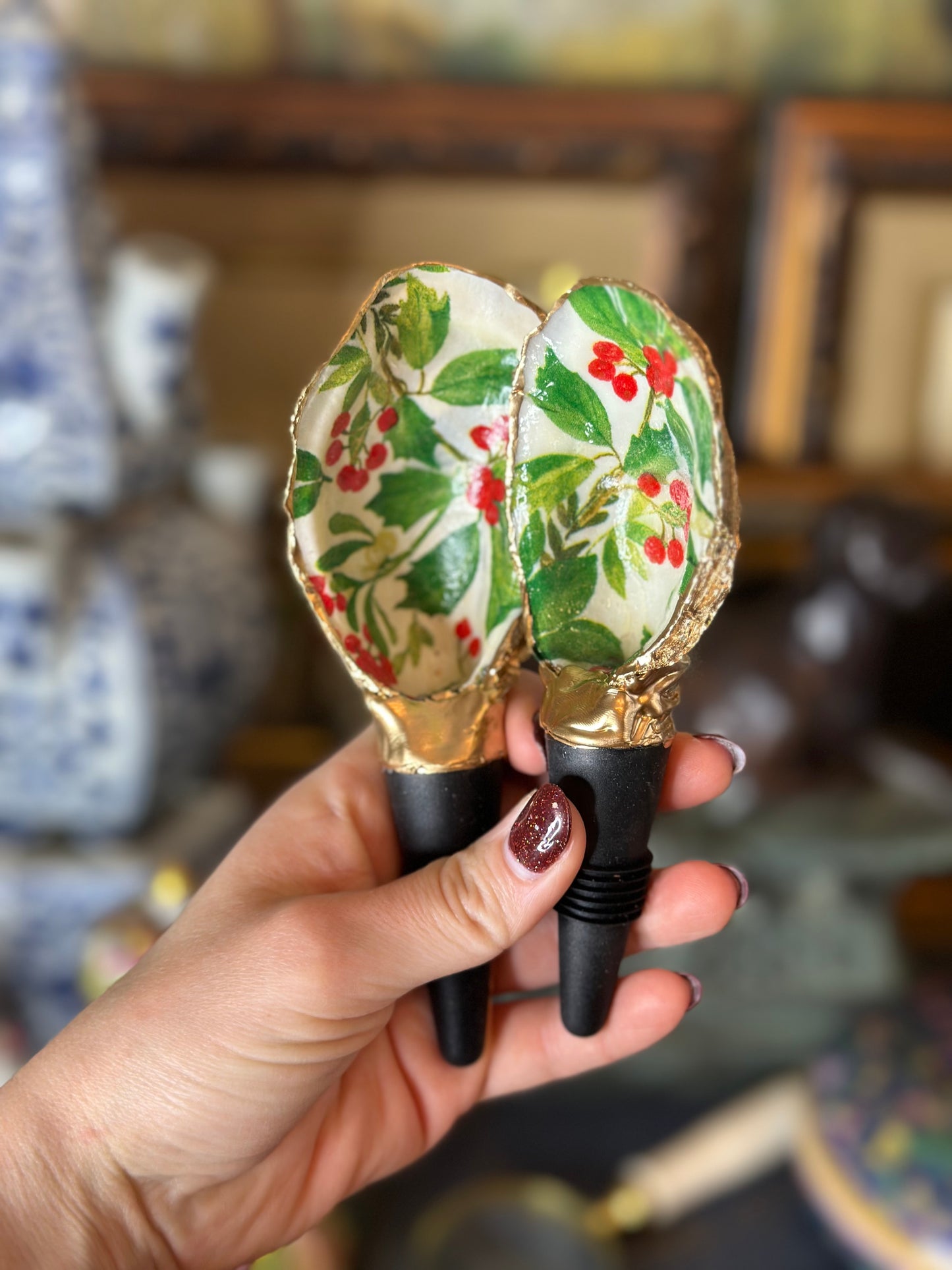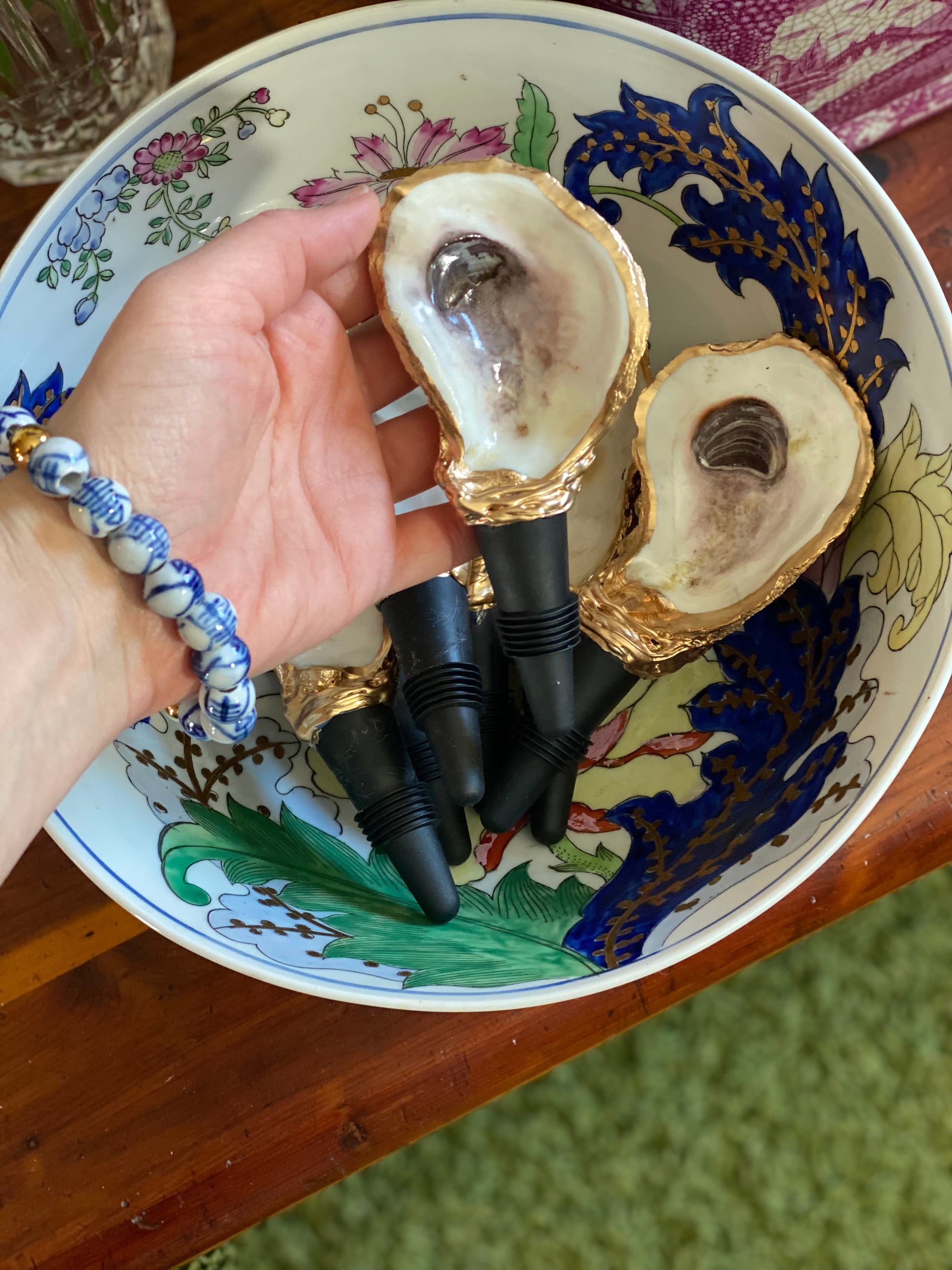 Handmade in SC from real oysters! These are washed, polished and gold-gilded with love in the USA. Each oyster varies in size from 2-3” long + the 2" long rubber stopper. Great hostess gift or stocking stuffer. Choose from natural or our latest Poinsettia floral one for the holidays!