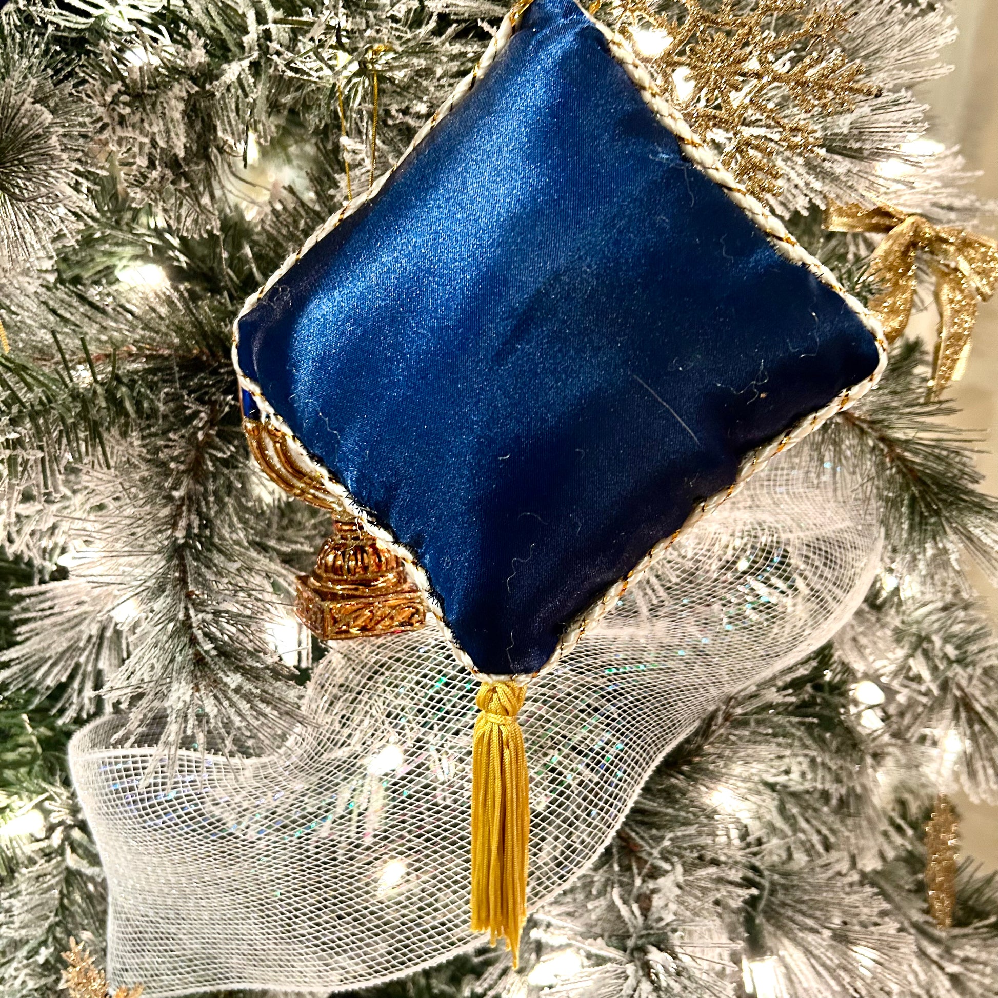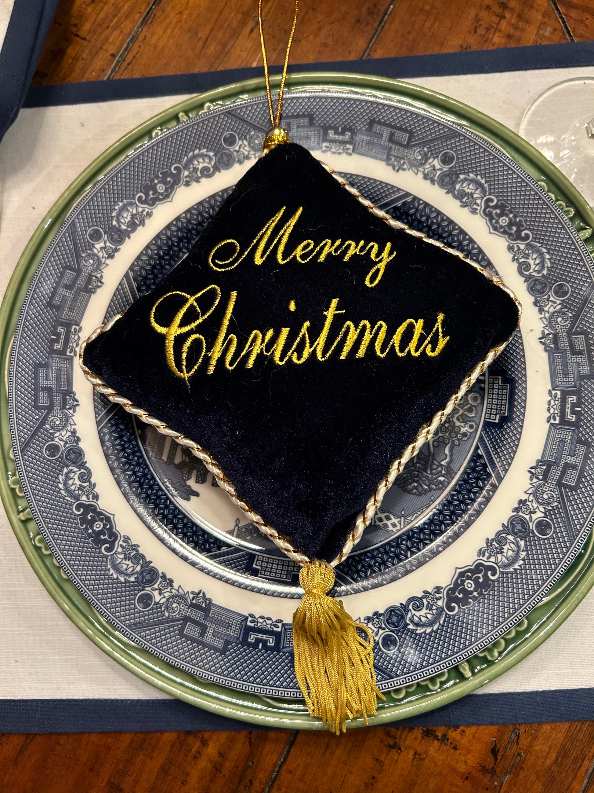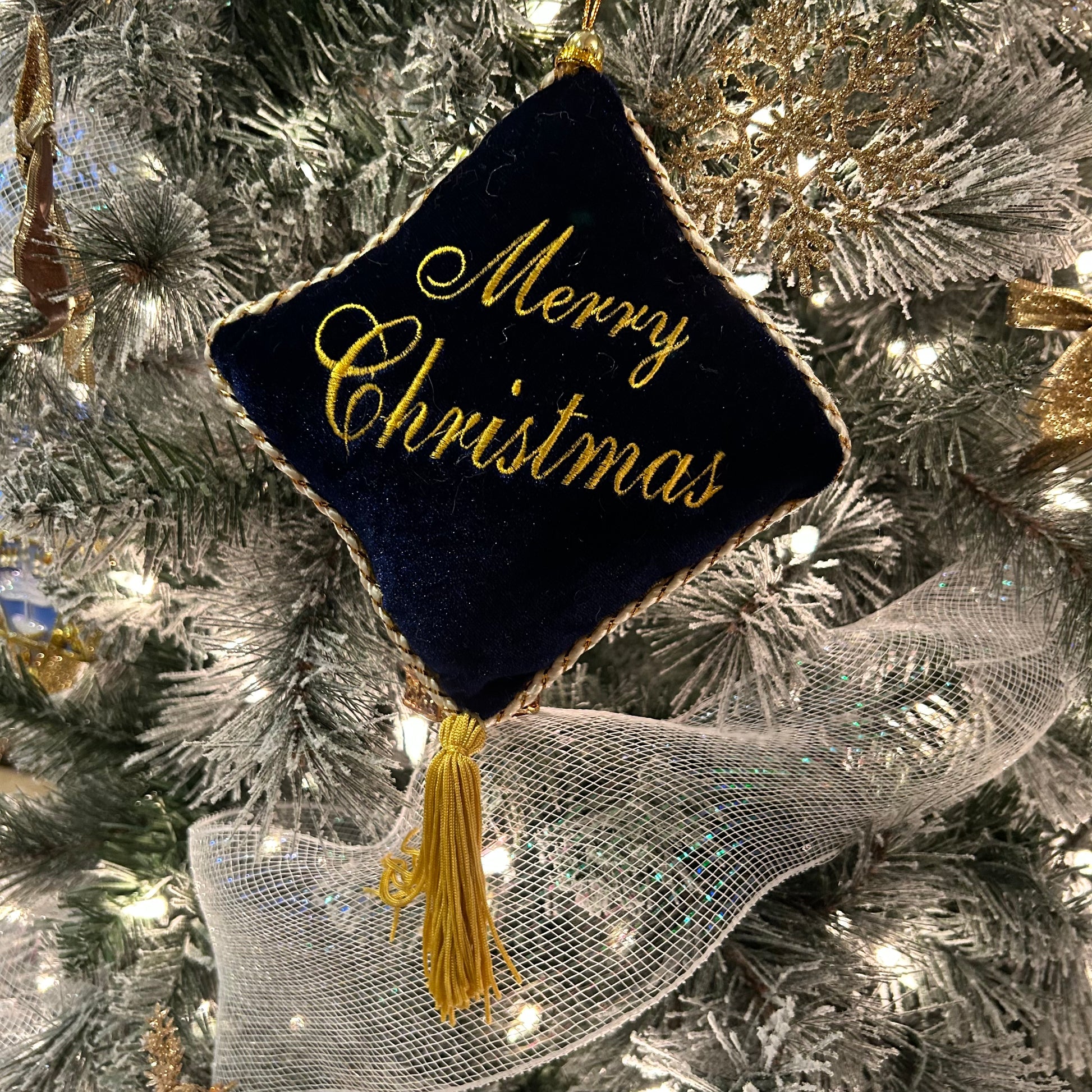 Bold blue & gold Seasons greetings Christmas tassel door hanger, or ornament