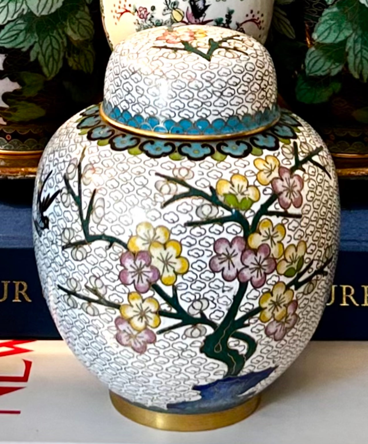 Crisp white vintage brass & enamel cloisonné etched ginger jar with lid